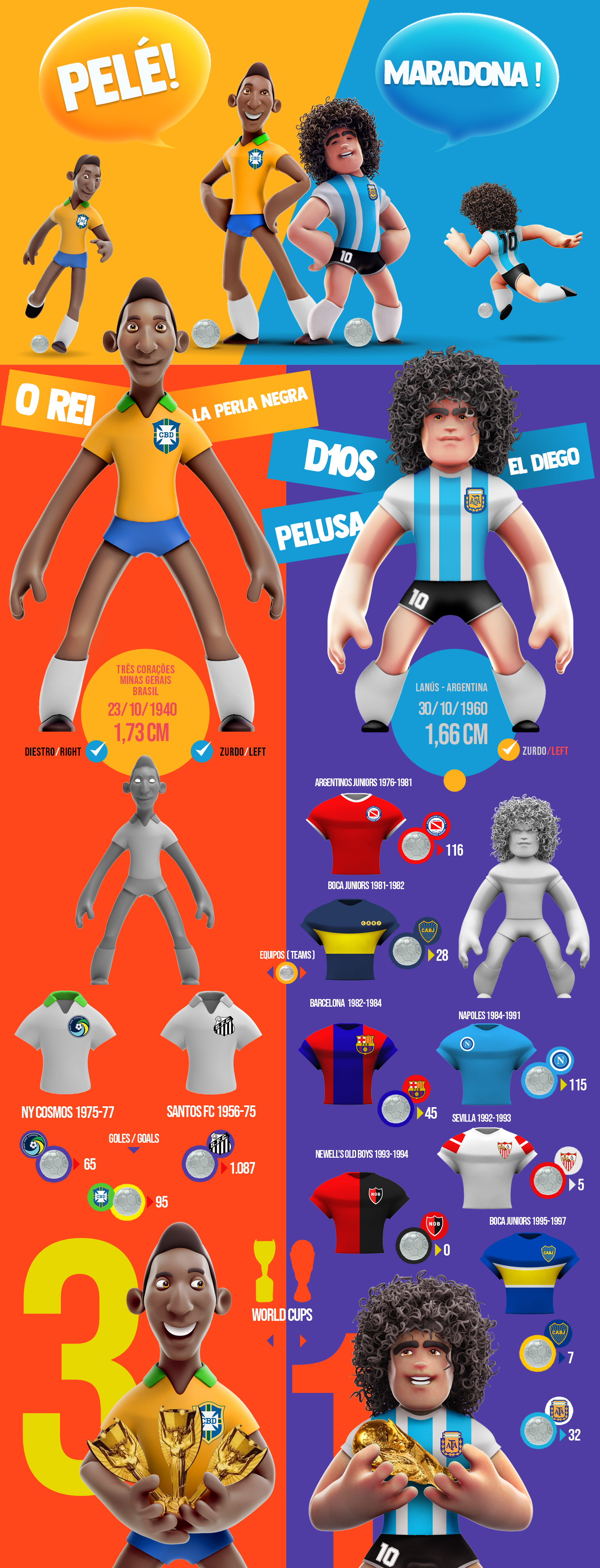 Dos infografías comparativas de Maradona/Pelé y Cristiano Ronaldo/Messi realizadas en ZBrush, KeyShot y Adobe Photoshop, espero que les guste.