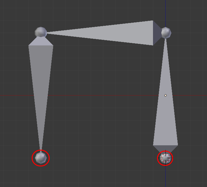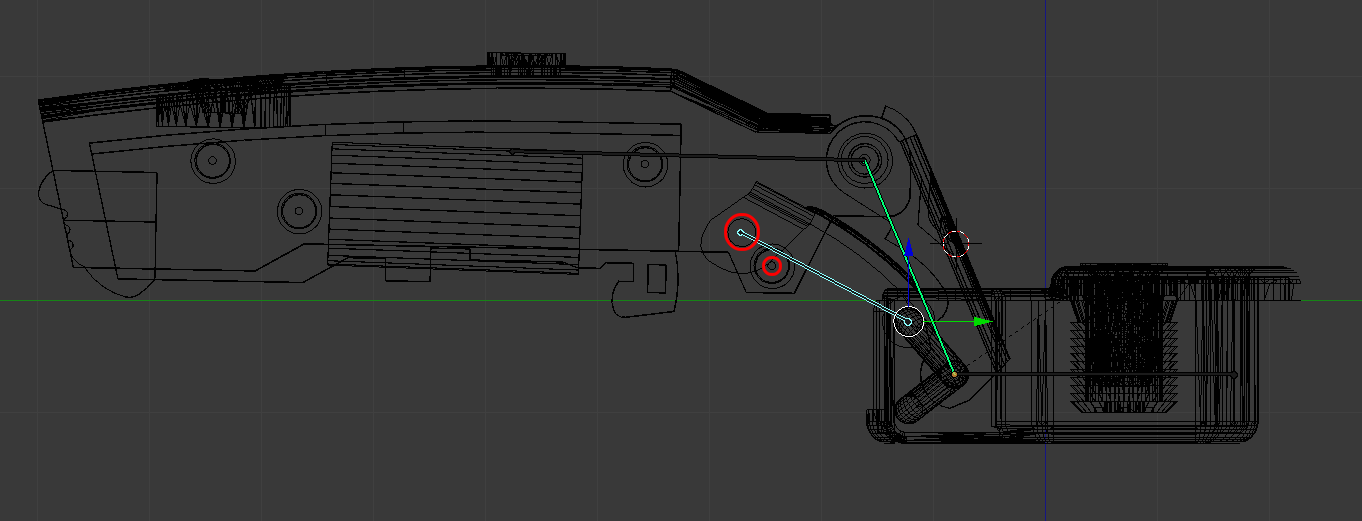 He cambiado los elementos por otros más simples para qué se vea más claro. He creado la cadena de huesos y sus vértices están donde yo quiero. Ahora lo que necesito es fijar el hueso que está de color azul para qué no se mueva respecto de la pieza Cazoleta. Tan sólo he emparentado la pieza cuerpo con su hueso, para qué se vea más claro.
