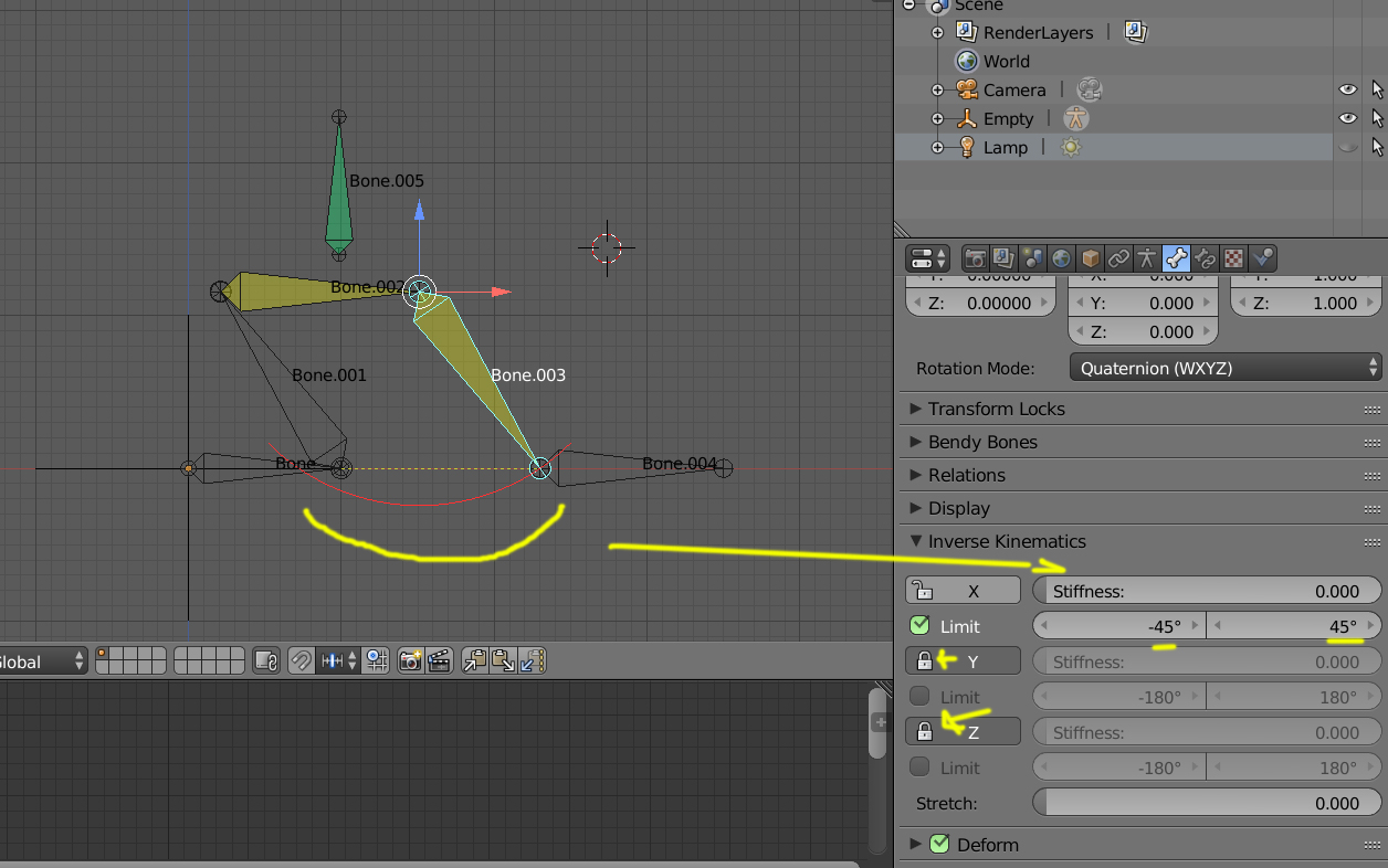 He intentado aplicar restricciones a dicho hueso azul para inmóvilizarlo, pero no hay manera. ¿Será que debo añadir Cinemática inversa?