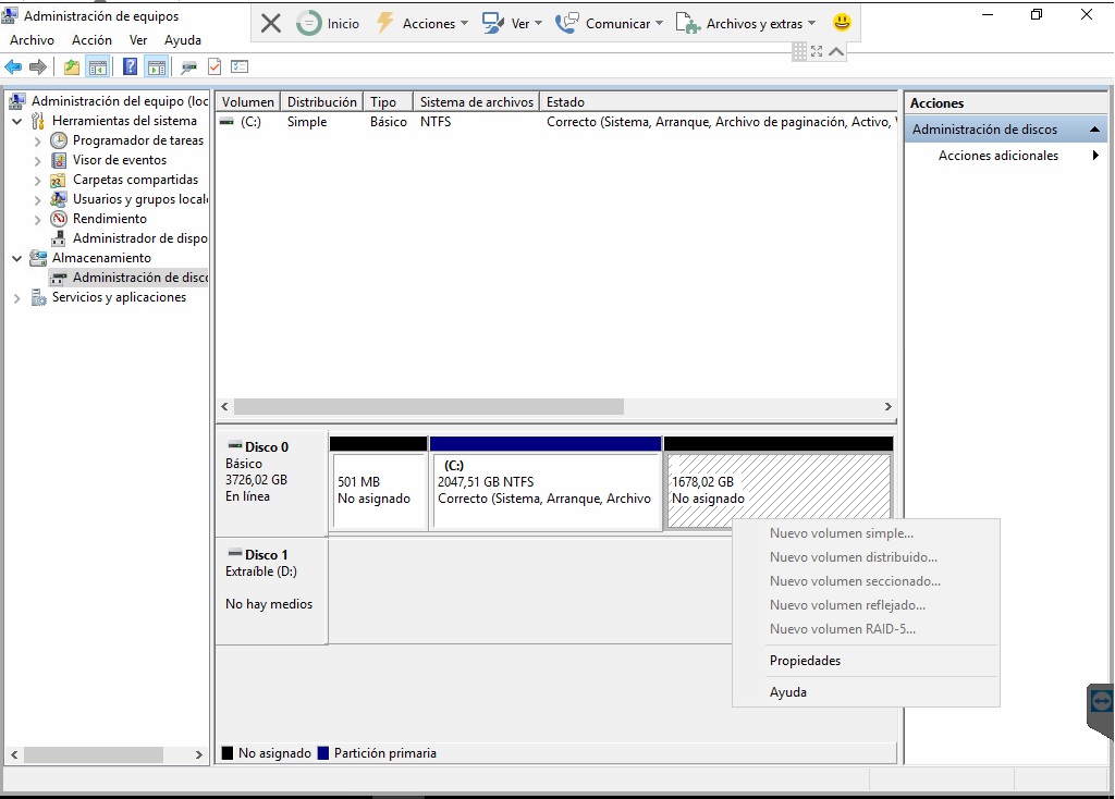 en el C instale el sistema operativo Windows 10 sin problemas, pero al querer formatear, o habilitar la unidad D no me permite acceder de ninguna manera, como podría hacerlo, adjunto imagen.
