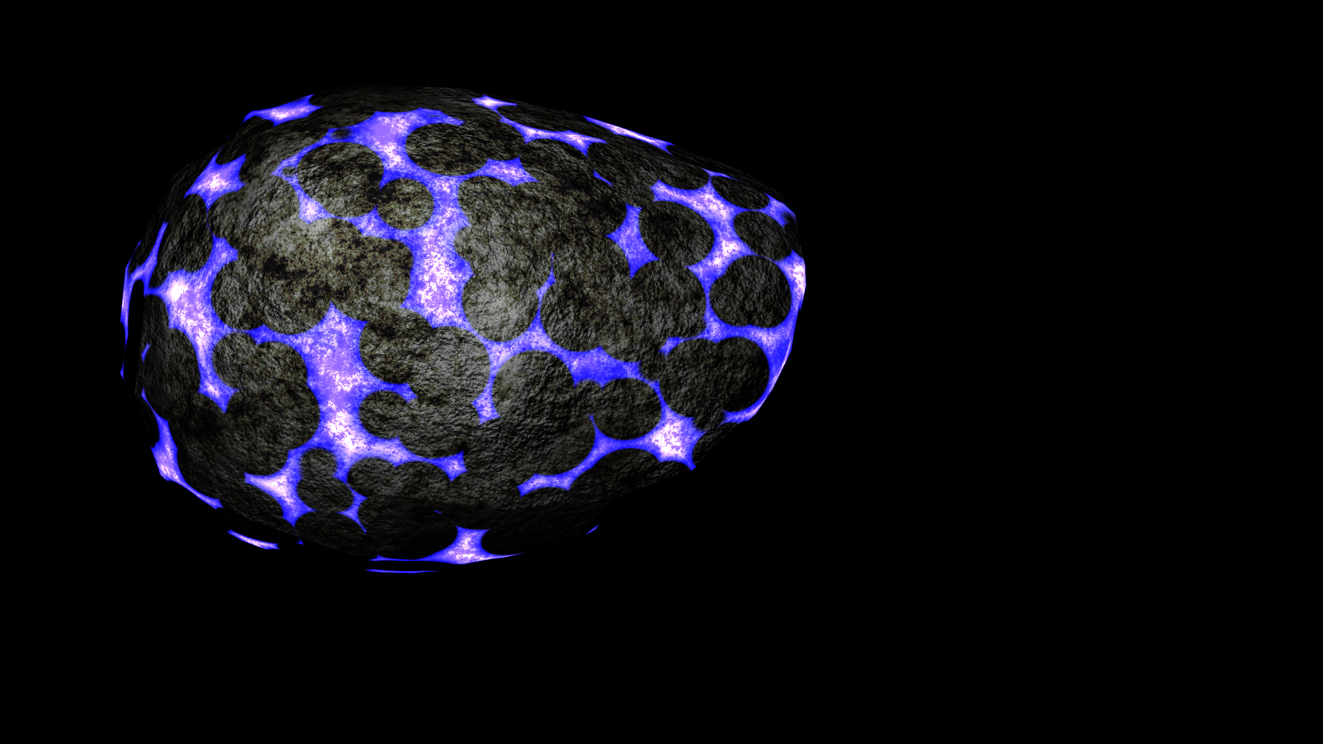 Ya conseguí un aspecto más cercano a grietas, aunque aún se nota demasiado esférico por usar el patron voronoi. Me gustaría saber si alguien conoce un buen tutorial para conseguir halos de luz desde mis grietas. Adjunto render y blend con este material 100% procedural por si a alguien le mola y lo quiere usar para algo.