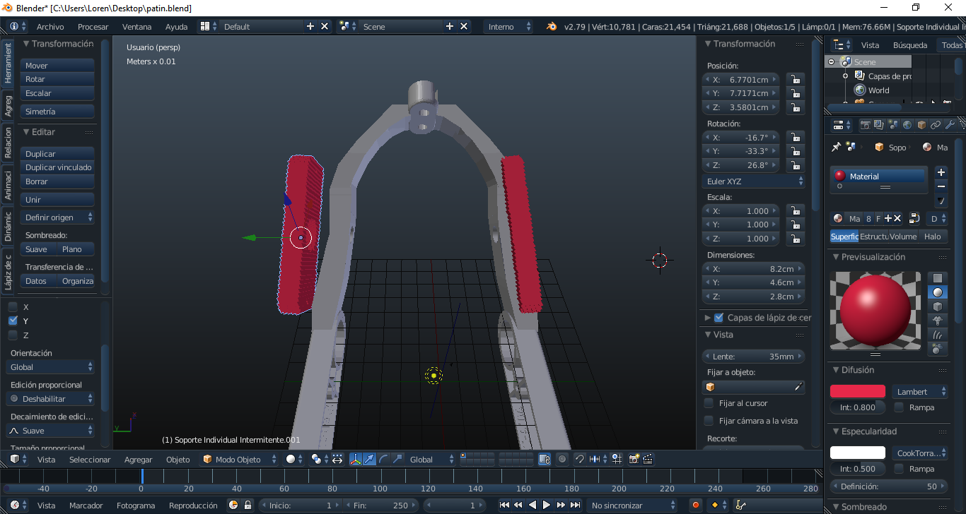 Buenas, he subido una fotografía, espero que la vean, soy nuevo en esto. He creado la pieza roja que ven en la fotografía, la he rotado y adaptado al brazo de la figura gris. Ahora quiero hacer lo mismo en el otro lado pero no se como. Me gustaría poder hacer una pieza simétrica para que solo sea moverla y ponerla en la misma posición que la otra (Eje x, eje Z.) el eje y debe cambiar. La pieza roja de la derecha es la que está ya colocada. En resumen lo que quiero hacer es que los mismos valores de rotación pero adaptandose al lado contrario.