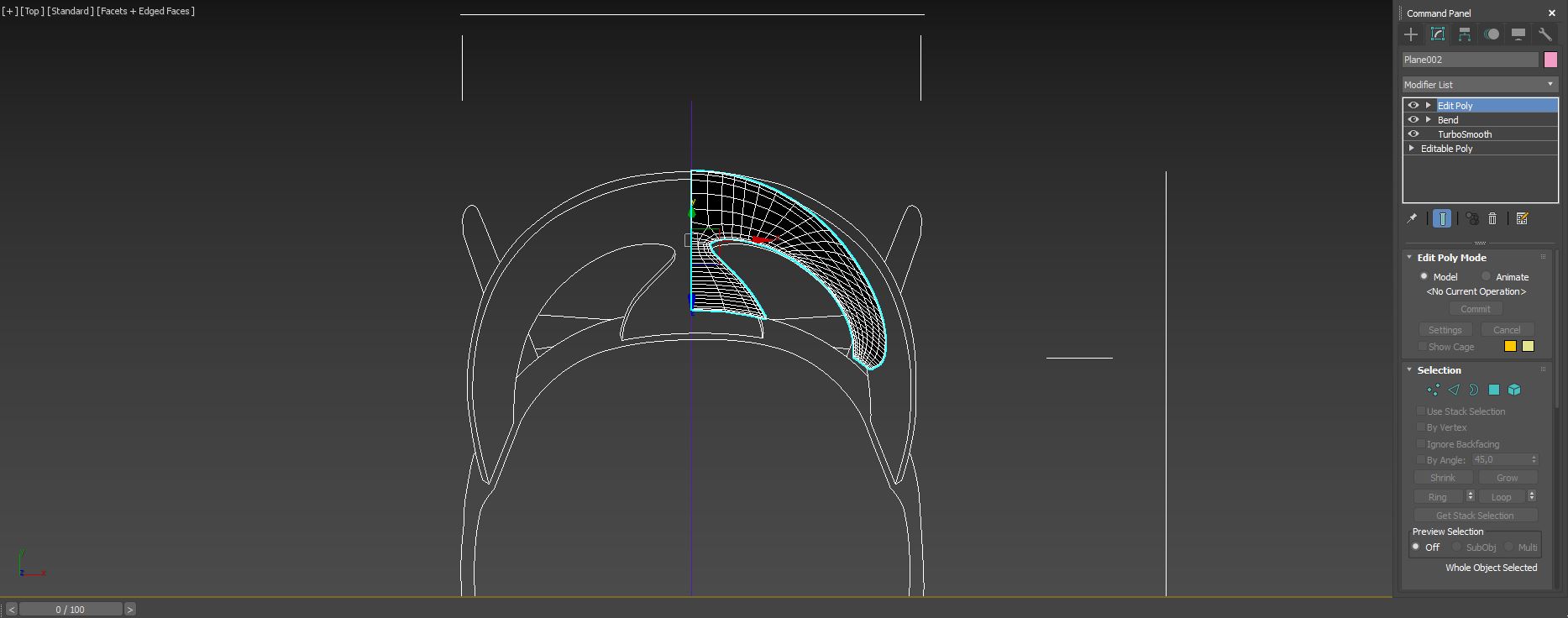 He empezado con la vista frontal con un plano, con la herramienta Cut he recortado su contorno y los agujeros. Para controlar la curvatura he usado unas loops resiguiendo ese contorno, luego he unido con quads el conjunto.
