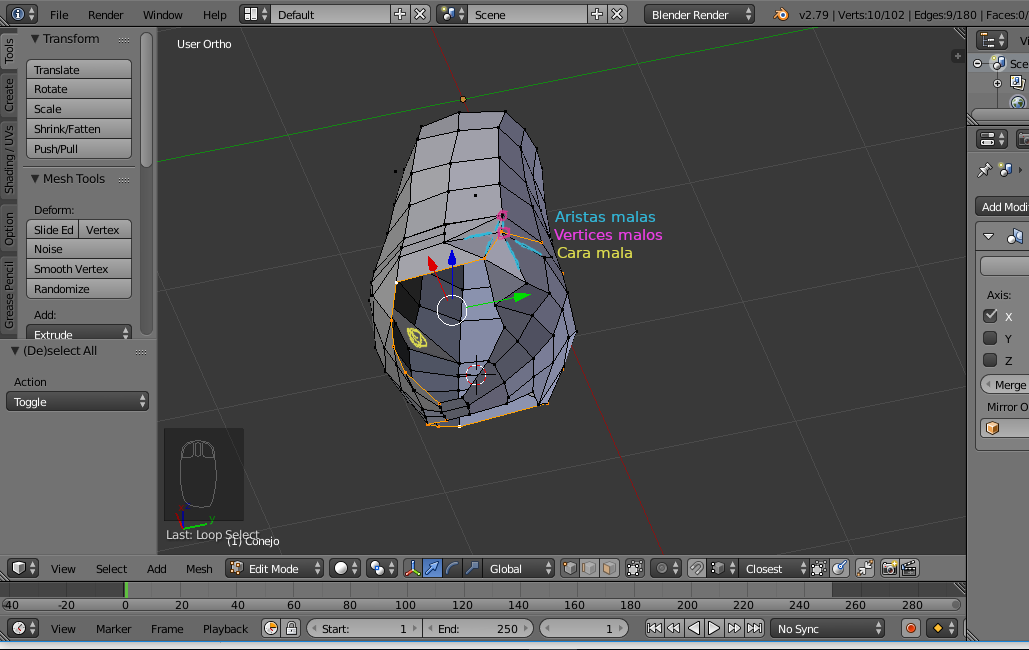 Hola buenas noches. Tengo un gran problema con un modelo que estoy creando (siguiendo un tutorial que vi) La cosa es que va todo bien, pero cuando comienzo a acomodar las vértices para que se vaya viendo con mejor forma el personaje, comienzo a tener problemas con las vértices, porque es como si estuvieran duplicadas o que hubiese vértices de más a la hora de presionar G y modiciarlas. Pero el verdadero problema es cuando intento extruir con E y hacerle las piernas. Se supone que deben aparecer como en un círculo seleccionadas las vértices alrededor para poder extruir hacia abajo y hacerle piernas. Pero la selección me quedó mal. Alguien podría decirme como arreglar eso? Soy muy nuevo en esto y no se como acomodarlo. Aquí dejaré la captura de como quedó (sé que está muy mal y bueno quiero aprender). Gracias de antemano a todos.