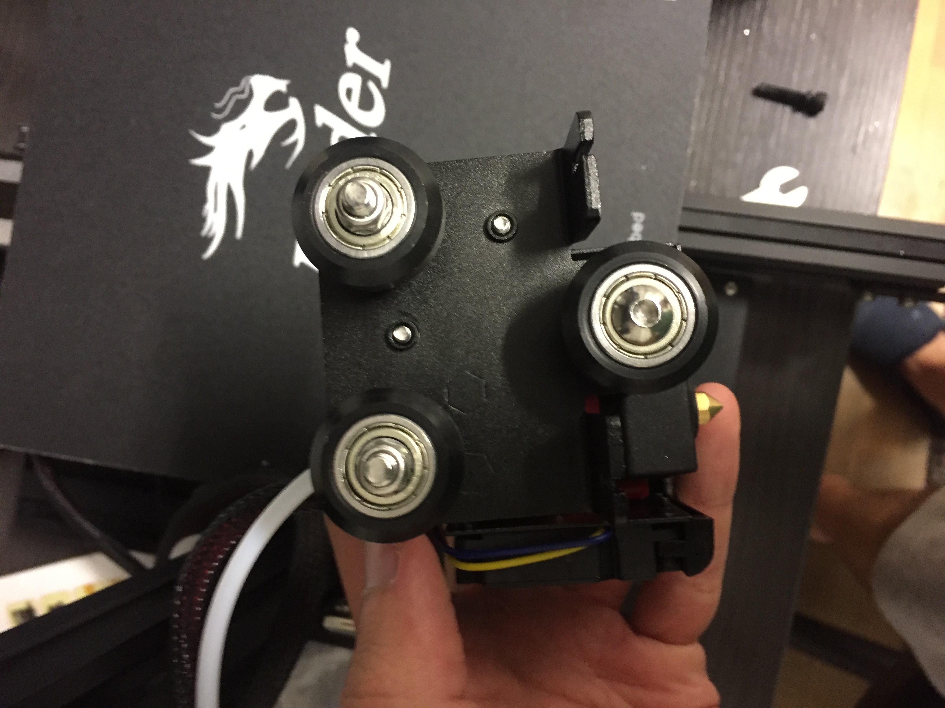 Buenas, soy nuevo en esto y acabo de montar la Ender 3 sin embargo la pieza del fusor baila en su recorrido. Me gustaría saber como arreglar esto ya que supongo que en la impresión podría bailar. Es como que los tres rodamientos no están bien puestos.