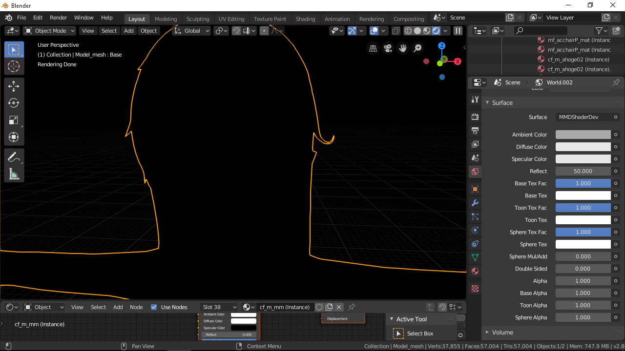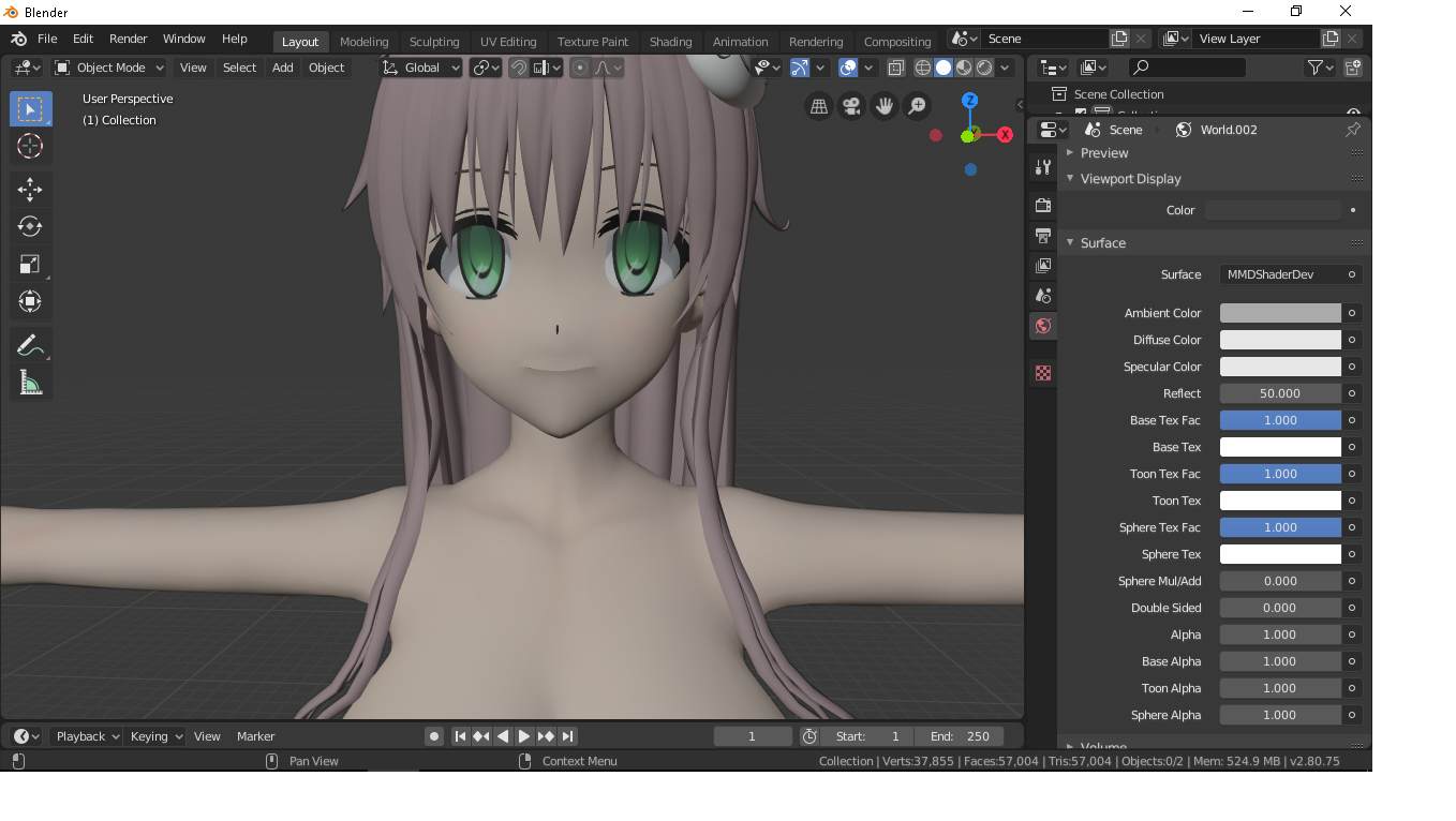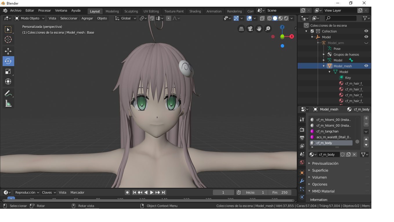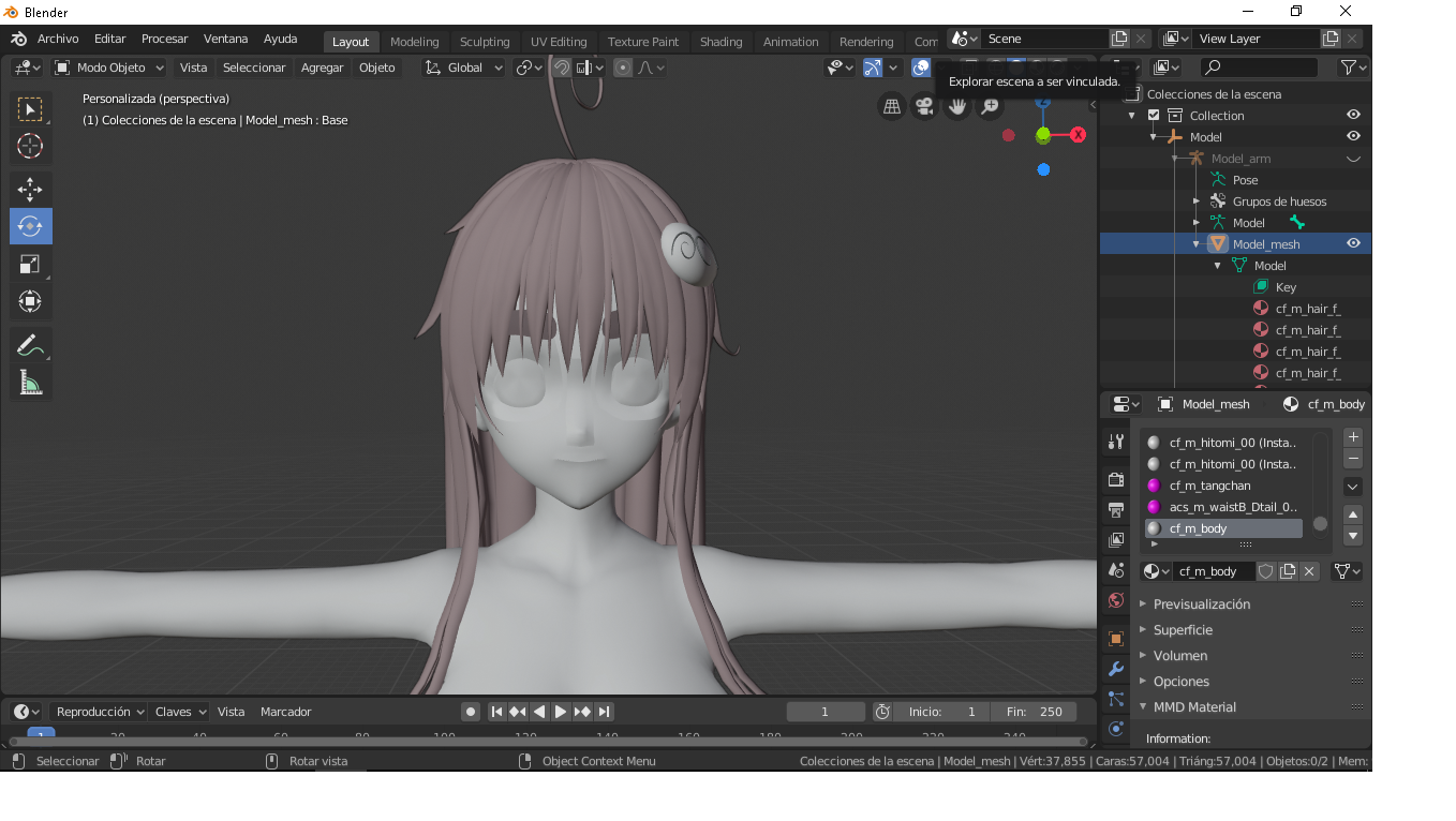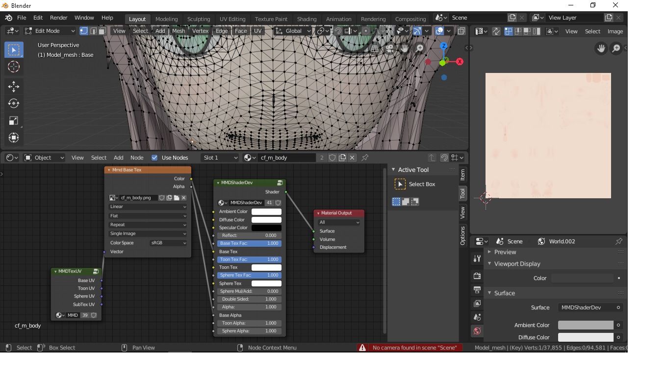 Al poder exportar del juego el modelo a Blender, se exporta bien (En pose T, con huesos y las texturas están en archivos diferentes), pero hay un problema, luego de cargar todo, solo puedo ver el modelo de forma correcta si selecciono la vista en modo textura, si lo pongo en modo material se ve distinto. No sé mucho de Blender, así que si pudieran guiarme estaría agradecido.