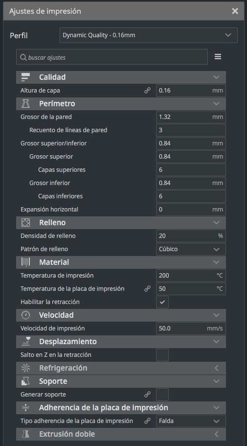filamento suelto. Me imagino que debe ser posible imprimir dos piezas de una vez y que para ello habría que cambiar los ajustes de velocidad, temperatura etc. Los ajustes que estoy utilizando hasta el momento son los que se ven en esta imagen: