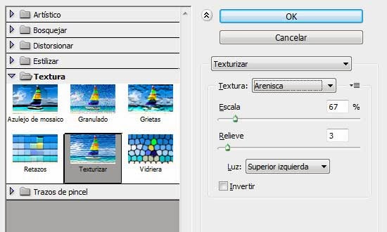 Ve a Filtro/Textura/Texturizar y aplica los valores mostrados a continuación