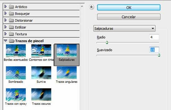 Ve a Filtro/Trazos de Pincel/Salpicaduras y aplica los siguientes valores.
