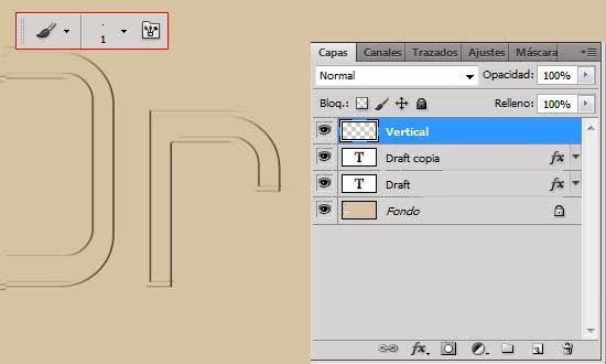 A continuación, pintarás líneas verticales sobre los bordes verticales de cada letra de tu texto. Para hacer líneas rectas presiona una vez el pincel para marcar el punto donde quieres que comience tu línea, ahora manteniendo presionada la tecla Mayúsculas presiona el pincel nuevamente donde quieras que termine y se creará una línea recta que unirá ambos puntos.