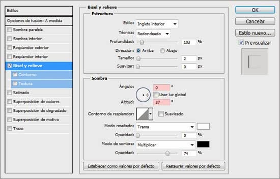 Doble clic a la capa de texto duplicada y cambia el ángulo y la altitud del Bisel y Relieve por los valores mostrados a continuación.