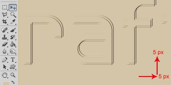 Selecciona la herramienta Mover y desplaza la capa duplicada 5 pixeles a la izquierda y 5 pixeles hacia arriba. (Para ello utiliza las flechas de tu teclado y pulsa 5 veces Flecha izquierda y 5 veces Flecha arriba).