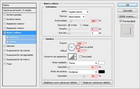 Doble clic en la capa de texto y aplica un Estilo de capa de Bisel y Relieve con los ajustes mostrados en la imagen de a continuación.