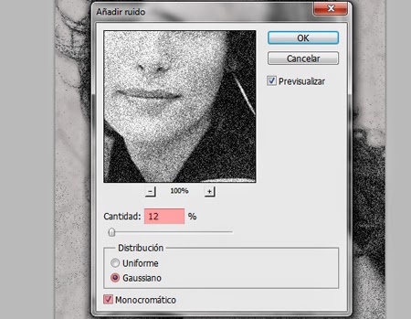 Usa una cantidad del 12%, con una Distribución Gaussiana, y activa la opción de ruido Monocromático.