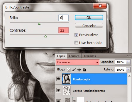 Para utilizar esta capa como base para el dibujo aumenta el contraste un poco en Imagen/Ajustes/Brillo y Contraste. Arrastra el control deslizante del Contraste hacia la derecha hasta alcanzar un valor de 22.