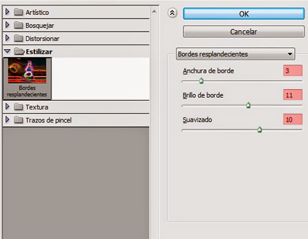 Arrastra esta nueva capa hasta la parte superior de la pila de capas, colocándola por encima del resto de capas. Seguidamente ve a Filtro/Estilizar/Bordes resplandecientes.