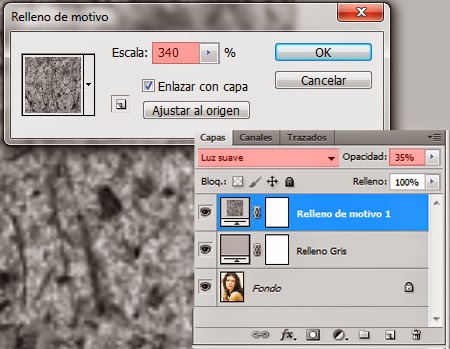 Aumenta su Escala al 340% y clic en Ok. Establece esta nueva capa en Modo de fusión de Luz suave con un 35% de Opacidad.