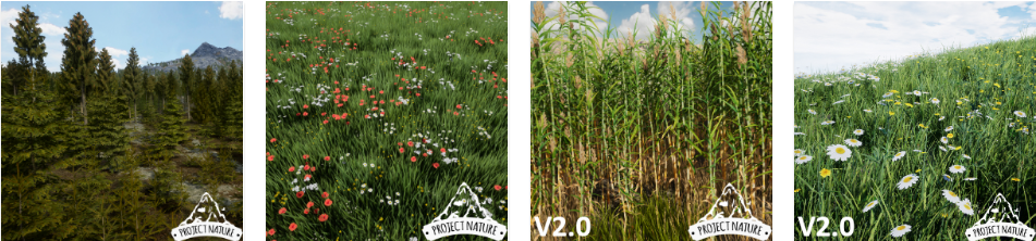 Se incluyen plantas de cualquier lugar del planeta, pastos, plantas herbáceas, arbustos y árboles, componen la mayoría de estos paquetes, algunos de ellos incluyen la animación de las adversidades atmosféricas como lluvia o viento. El enlace directo: https://www.unrealengine.com/marketp...Project+Nature.