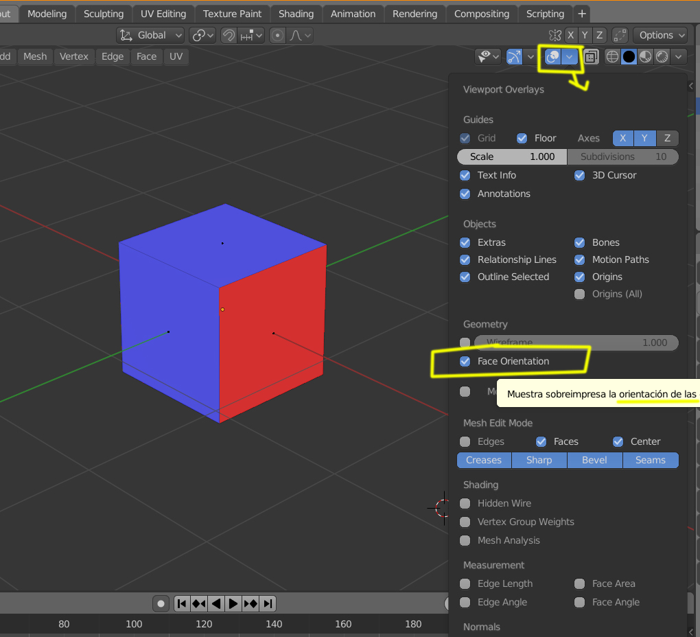 Si quieres ver en pantalla si una cara está invertida. activa lo siguiente.