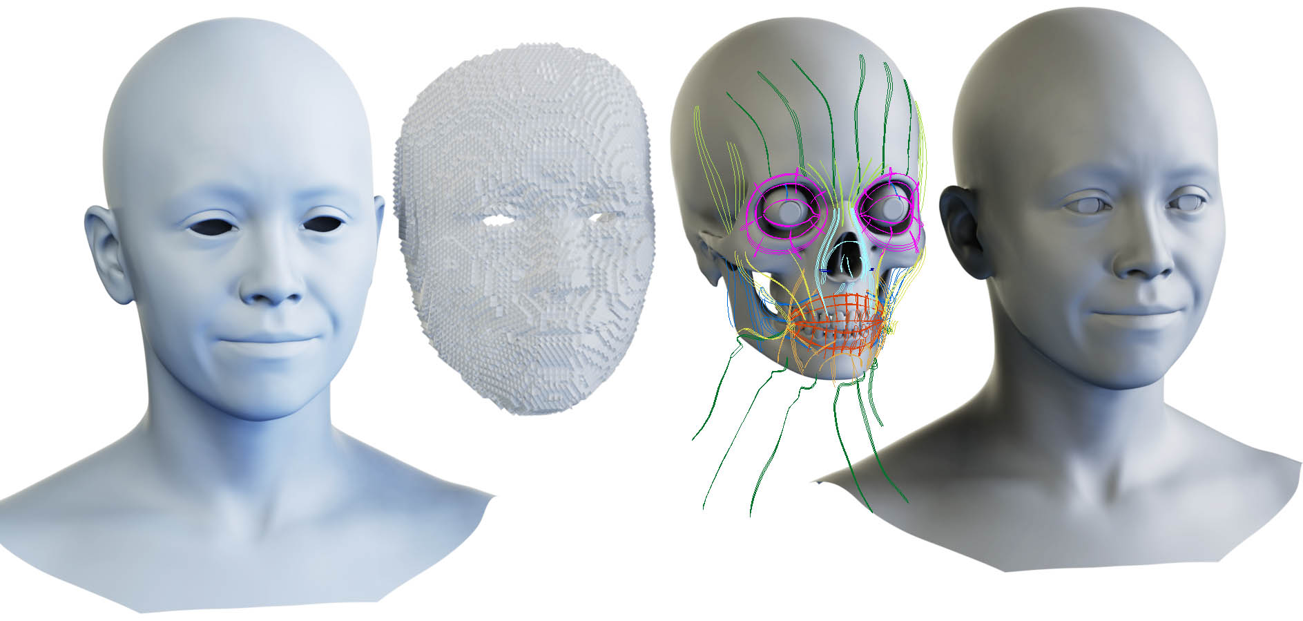 Por ejemplo, para simular un parpadeo se utilizan curvas musculares a lo largo y alrededor del ojo, y se escala la curva vertical a lo largo de la forma del globo ocular. Este sistema permite crear expresiones faciales de manera más eficiente que los métodos tradicionales como encadenar blendshapes.