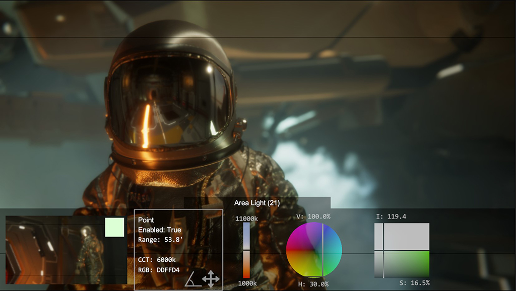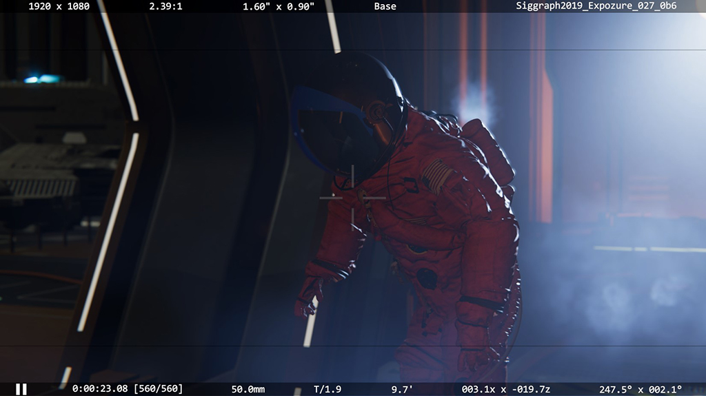 A continuación adjunto algunas capturas de secuencias renderizadas en tiempo real. La escena del astronauta se hizo mediante captura de movimiento, con encuadre, iluminación y edición, todo ello sobre la marcha. Vemos también como la cámara V de Expozure puede ajustar la iluminación en tiempo real.