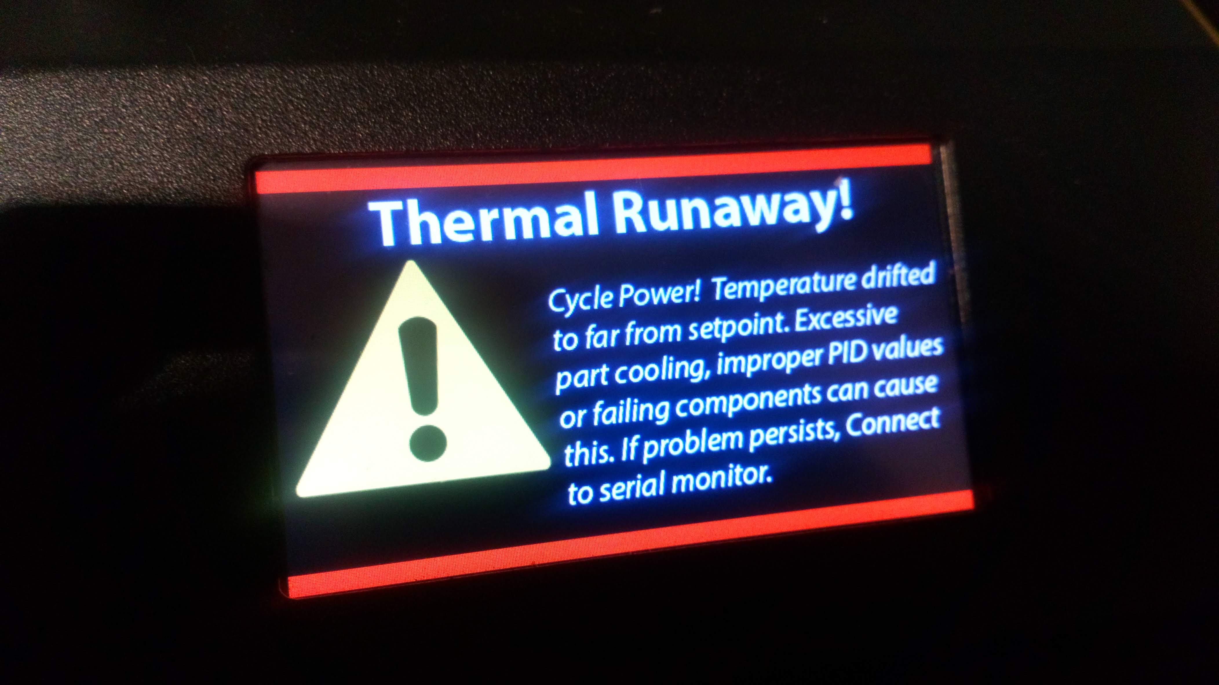 hola escribo porque estaba imprimiendo y me di cuenta que la impresión había parado y al mirar la pantalla me encontré el mensaje que sale en la fotografía que adjunto y la verdad que lo he traducido pero no e sacado nada en claro e intentado volver a imprimir después de apagarla desconectarla y me empieza bien pero cuando lleva un rato empieza la oscilar la temperatura yo imprimo a 190 y empieza a subir por ejemplo 198,195,180,172,188 y así hasta que cuando lleva un rato salta ese error agradecería la ayuda ya que e buscado bastante y no e sacado nada en claro.