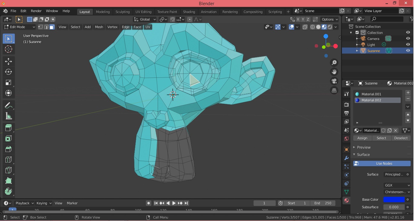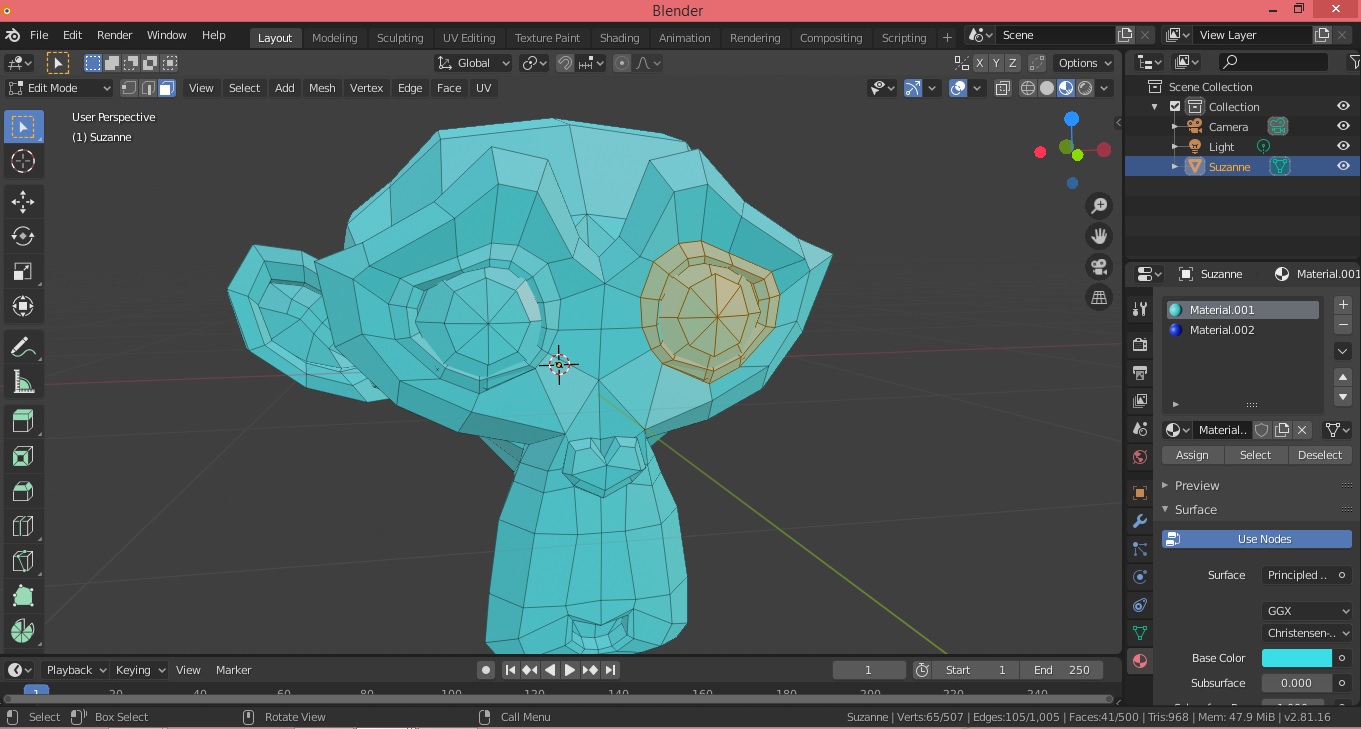 Buenas, me ha surgido un problema hace ya un tiempo, desearía saber cuál es la solución, pregunte en otros foros pero veo que este está más activo. El problema surge cuando quiero añadir más de un color a cualquier objeto en Blender, este es un ejemplo, pondremos a la mona Suzanne y le añadiremos un color celeste y ahora iré a modo edición y le añadiré un color diferente a sus ojos, comienzo seleccionando las caras que quiero colorear y le pondré un color azul.
