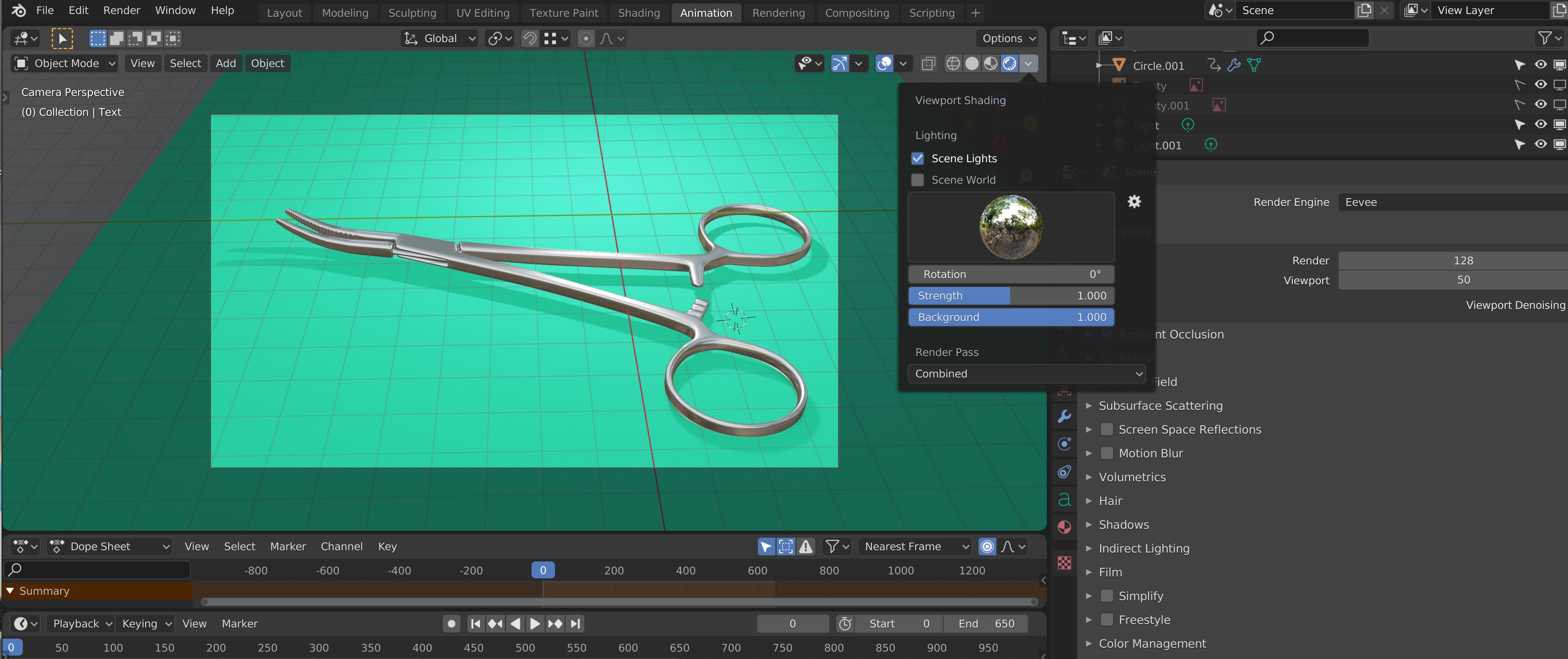 También puse un material sencillo que simulara metal. En una prueba anterior quedó bien, pero no en esta. Importé todos los datos de la prueba que estaba bien, y he corroborado que los nodos fueran iguales, pero nada. Se ve más claro en el render que en el viewport shading, pero en ninguno se ve como metal exactamente. En Cycles se ve peor, pero imagino que el problema es la luz.