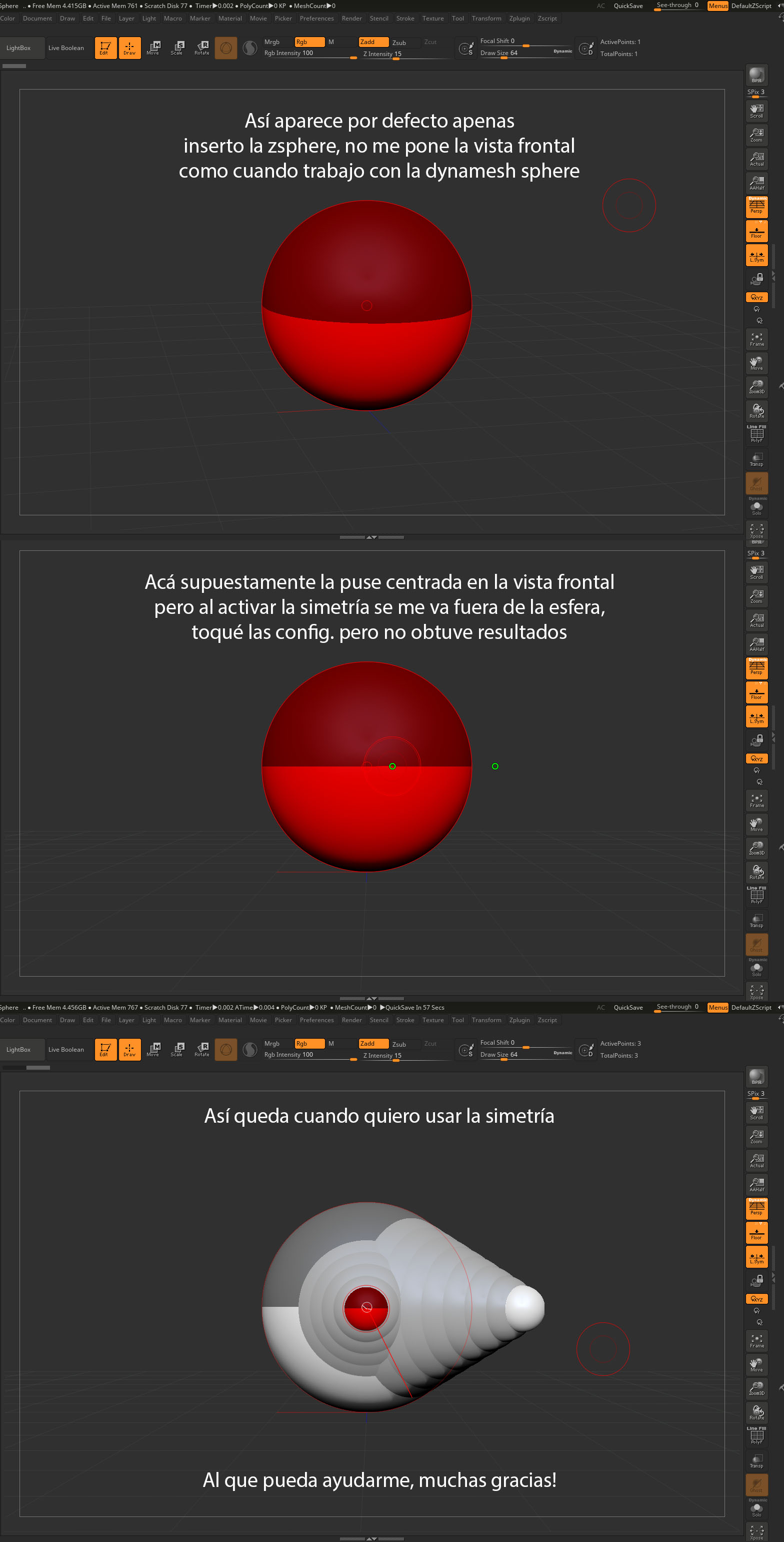 Hola, hace poco volví a instalar ZBrush porque había tenido problemas con el sistema de Windows y tuve que reinstalar todo, la cuestión es que, cuando quiero hacer una estructura con las ZSpheres no puedo hacer que funcione bien la simetría, es como si la esfera estuviese corrida del centro, pero así tal cual se abre por defecto cuando quiero comenzar a trabajar, le he cambiado las configuraciones de simetría para ver si podía ser algo de eso pero no pasó nada, la quise acomodar manualmente y tampoco se corrige, antes lo he usado varias veces y nunca tuve este problema, no sé si será una mala instalación que está tirando error o es algo que me estoy pasando por alto, les dejo fotografía para que vean, muchas gracias de antemano.