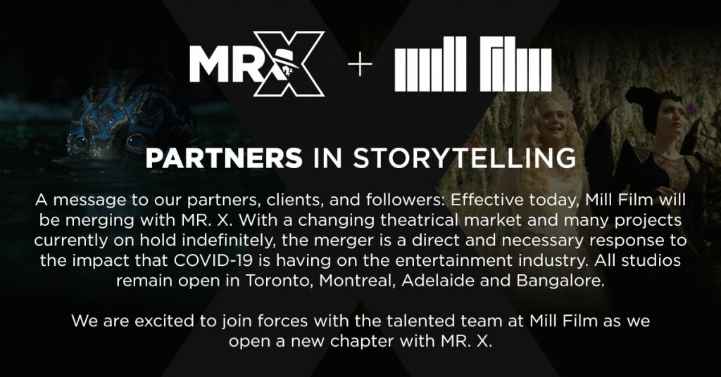 Fusión entre los estudios Mill Film y Mr. X, veremos más de una fusión o práctica empresarial similar a esta en los próximo días, es conocido por todos que el coronavirus tiene que afectar en mayor o menor media a todos los sectores, incluyendo a la industria del cine, efectos visuales, VFX, si bien es uno de los sectores que pudieran estar menos perjudicados por la facilidad del trabajo online, los rodajes con personas reales sí se ven afectados en el tiempo, teniendo que postergar en muchos el rodaje de las escenas.