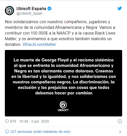 Detrás de cada videojuego suele haber una empresa, en este caso Ubisoft es la que se manifiesta contra el racismo y decide apoyar la causa con 100.000 dólares para la lucha contra el racismo. La persona responsable de Assassins Creed se ha unido al movimiento Black Lives Matter.