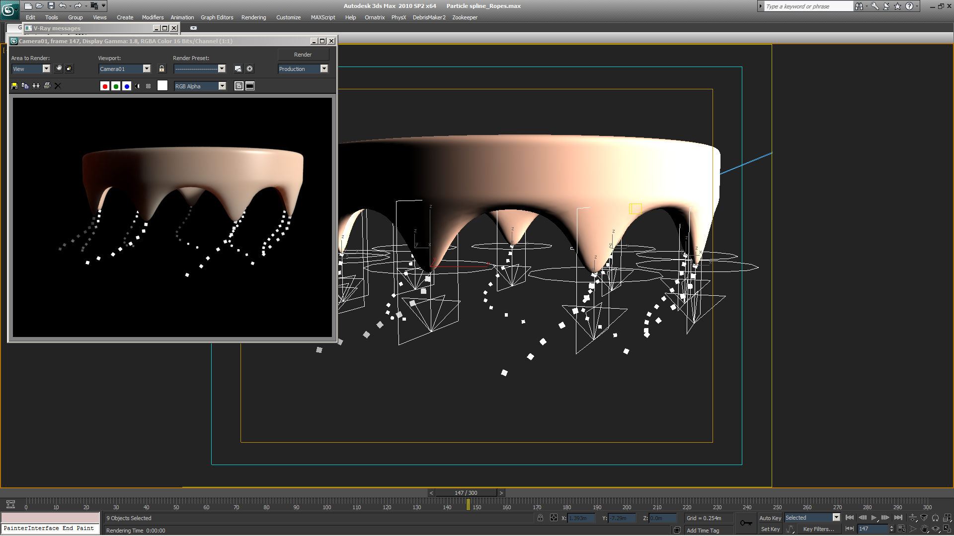 Luego para hacer cuerdas sueltas al viento, lo más práctico que puedes hacer es usar sistemas de partículas y un objeto llamado Particle Spline el cual convierte el chorro de partículas en una Spline, y si le colocas viento al sistema de partículas, la Spline se moverá como una cuerda al viento.