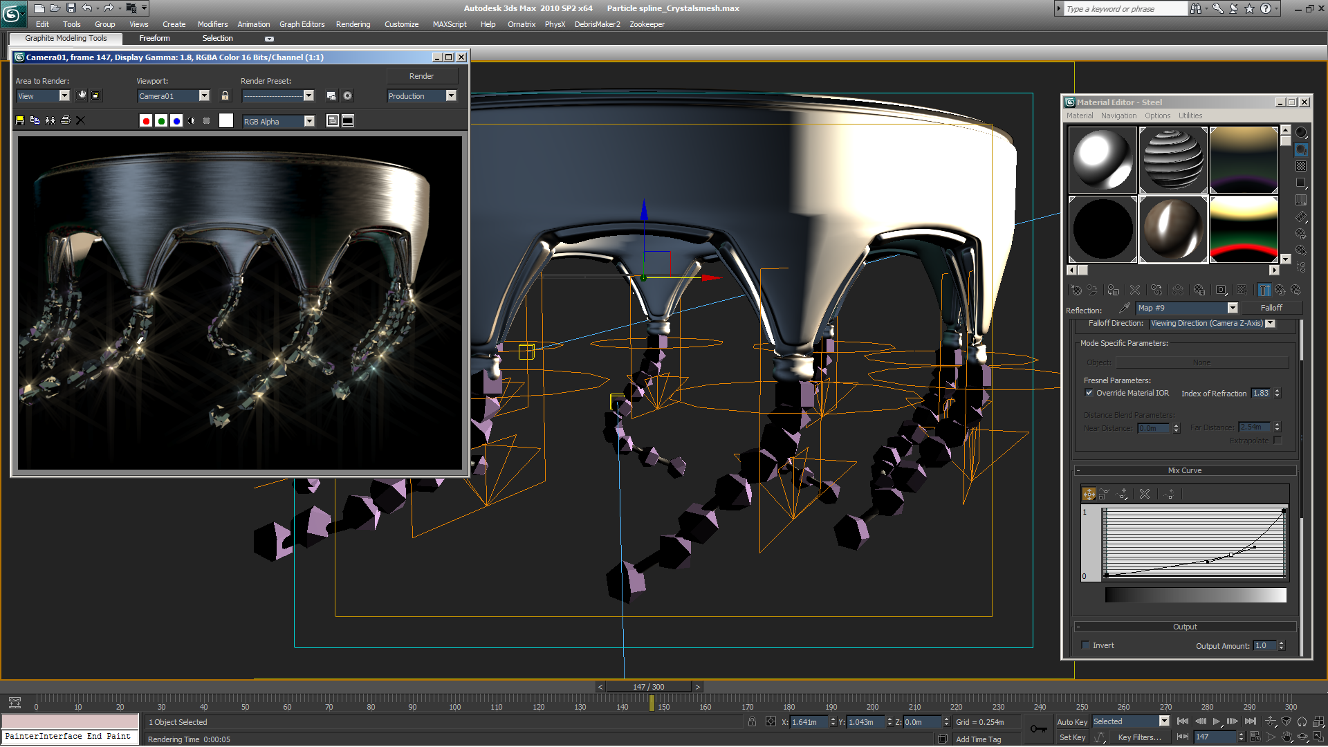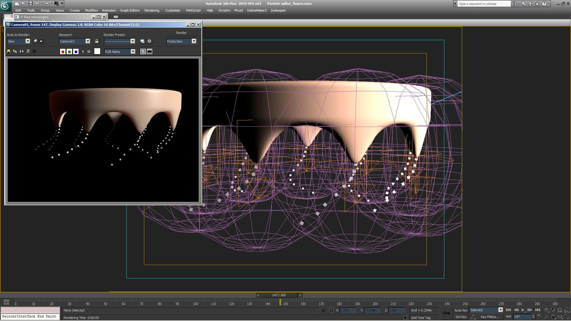 Se crea un objeto Particle Spline (ubicado en el área de splines) y se le admite el sistema de partículas creado. Este objeto creará una Spline basada en l interpolación de la posición del chorro de partículas, y como esta emisión es muy alineada, la Spline seguirá perfectamente las partículas.