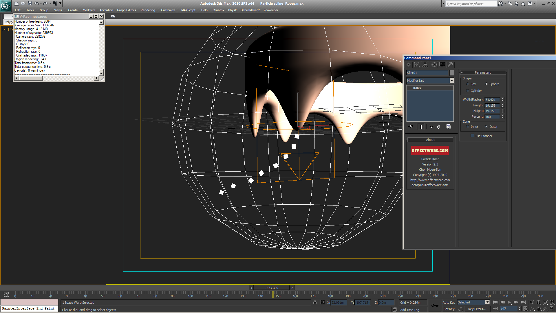 Nota importante: para que la cuerda no se estire como un elástico, las partículas que se alejan por fuerza centrífuga deben ser eliminadas, para tal fin se crea un spacewarp llamado Particle Killer, de forma esférica, y se enlaza el Super Spray a ese spacewarp, el cual está configurado para que sólo existan partículas dentro de esa esfera, de ese modo, la cuerda se corta desde la esfera haca afuera.