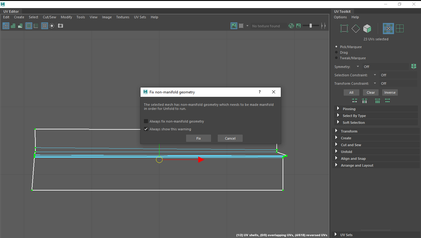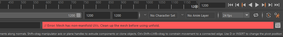 Buen día a toda la comunidad. Quisiera que alguno de ustedes me ayude con el siguiente problema que estoy teniendo con Maya a la hora de crear las UVS y hacer unfold. Probé de todas las maneras. Cambié directx11 a OpenGL creyendo que el inconveniente venía por ahí, pero no se solucionó. Voy al grano. Después de crear un planar mapping seleccioné las UV. Luego di unfold y me salió un cuadro donde dice "fix non-manifold geometry"