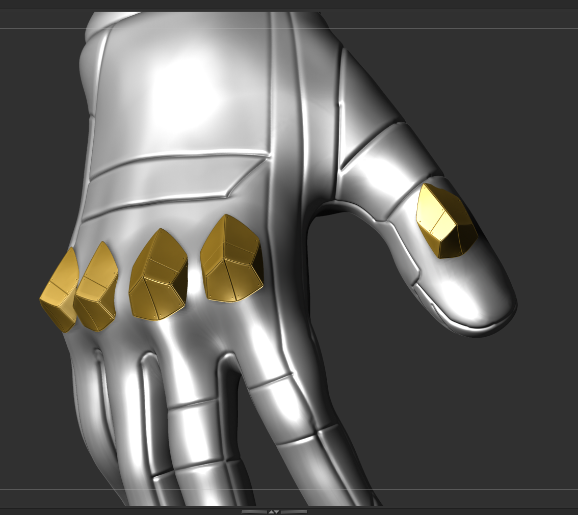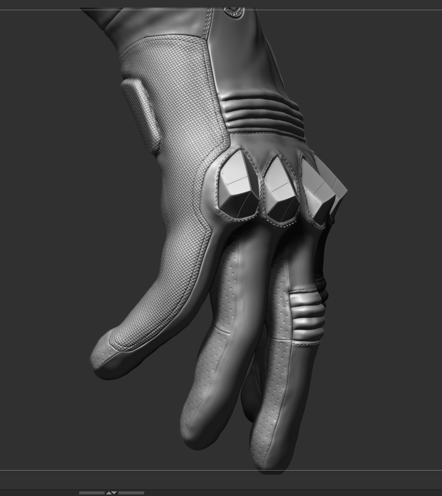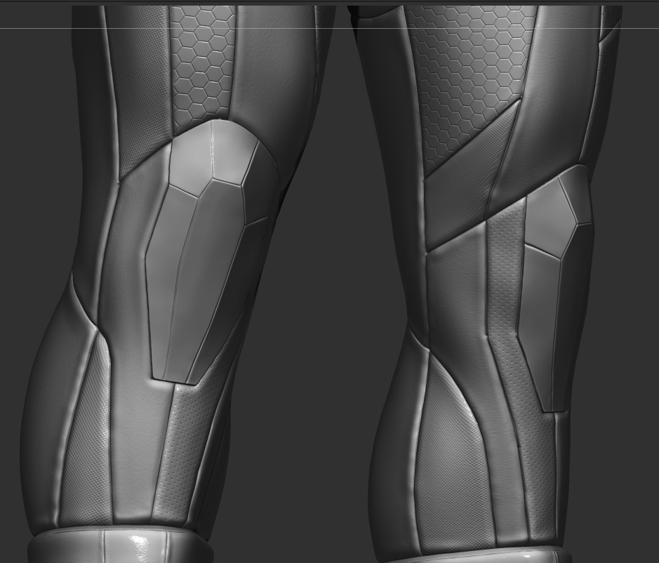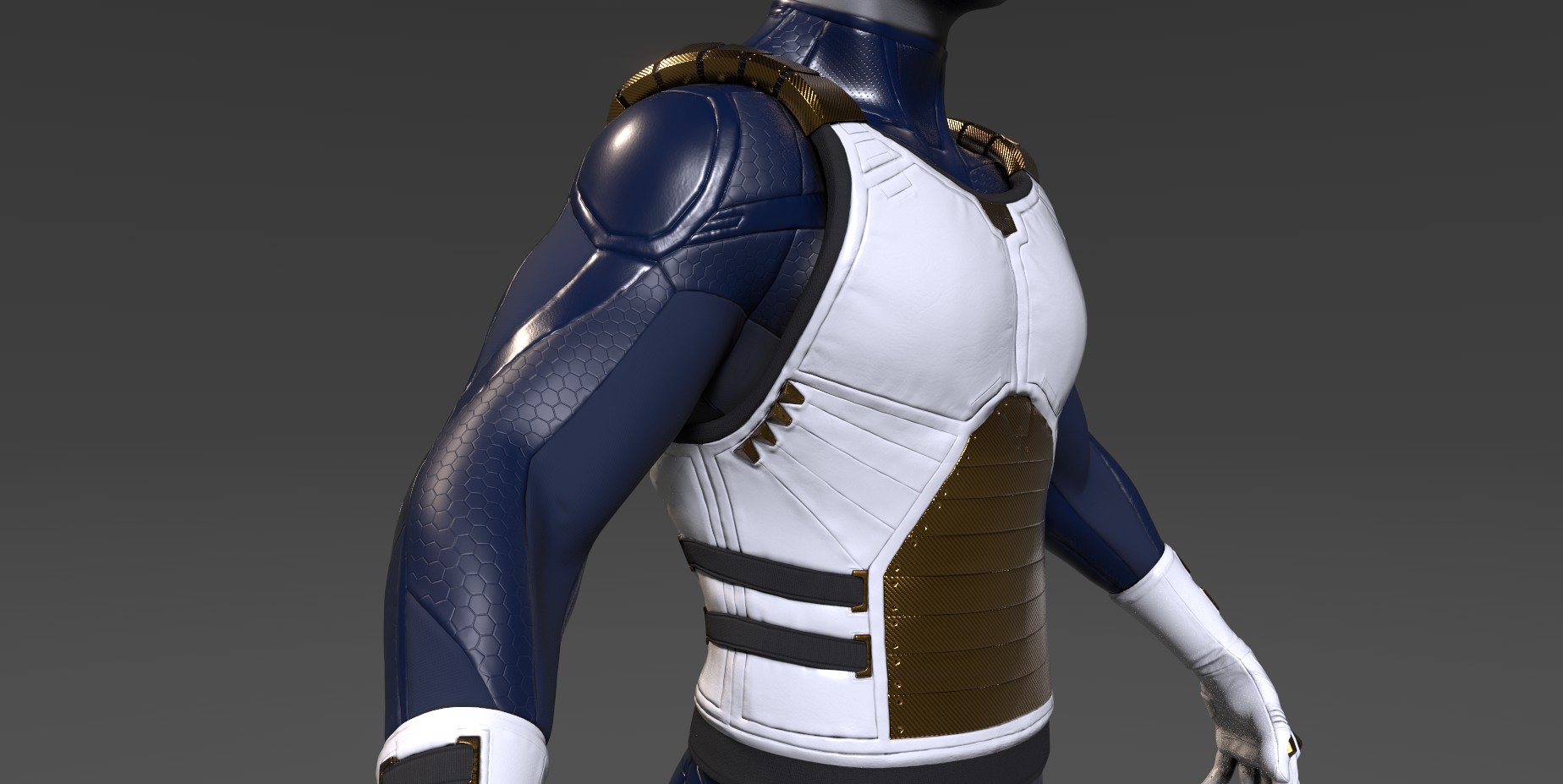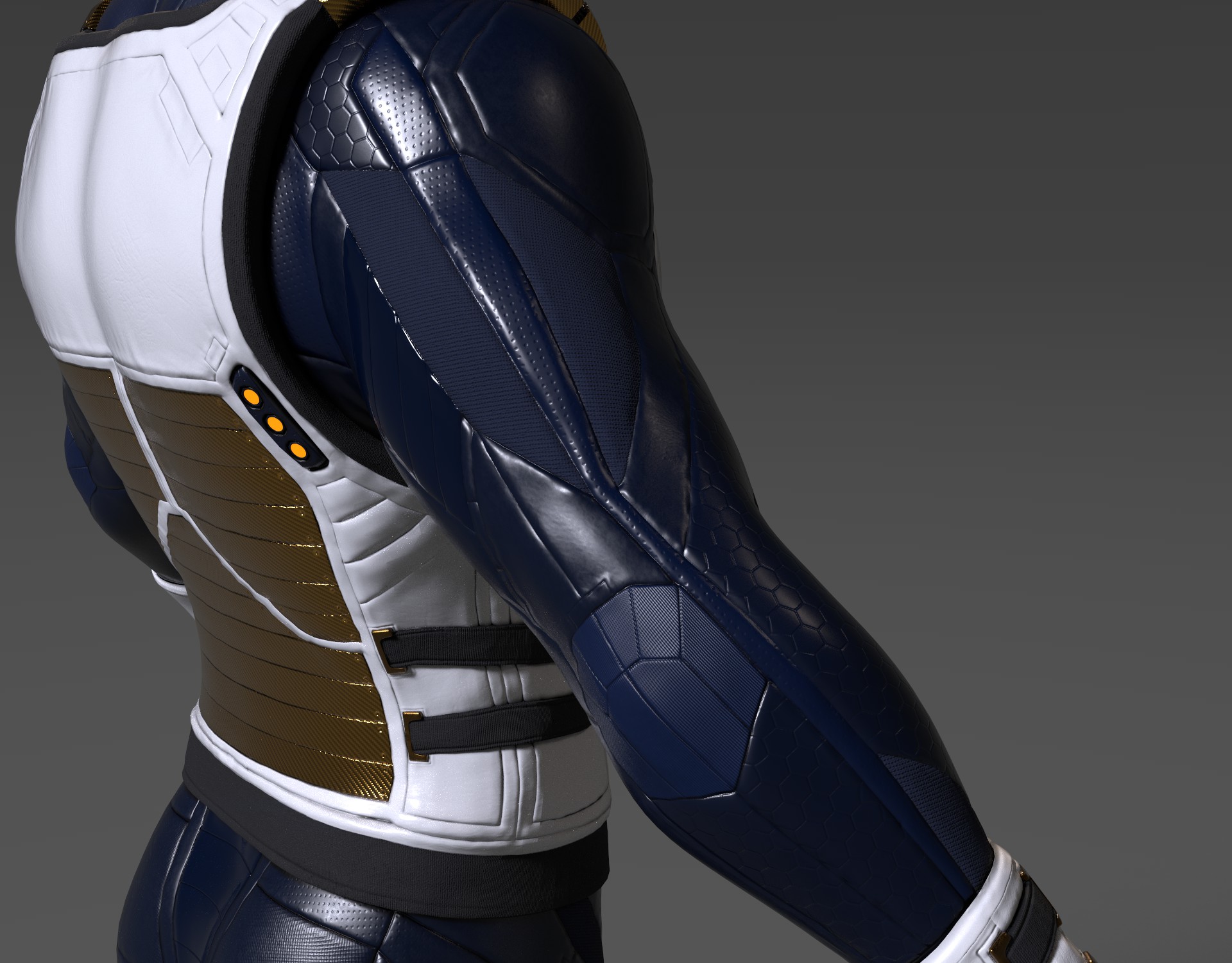 por ejemplo el azul queda bien en las zonas con textura hexagonal y en la hombrera, pero la parte interior del codo, que sería más flexible, parece quedar mejor con el gris, no sé, yo iría probando a ver. Difícil de aconsejar.