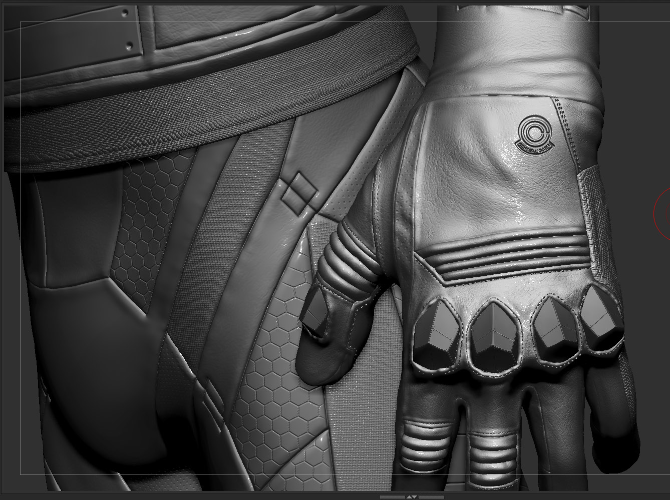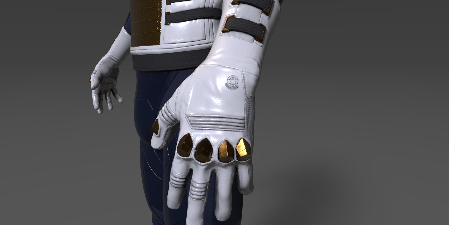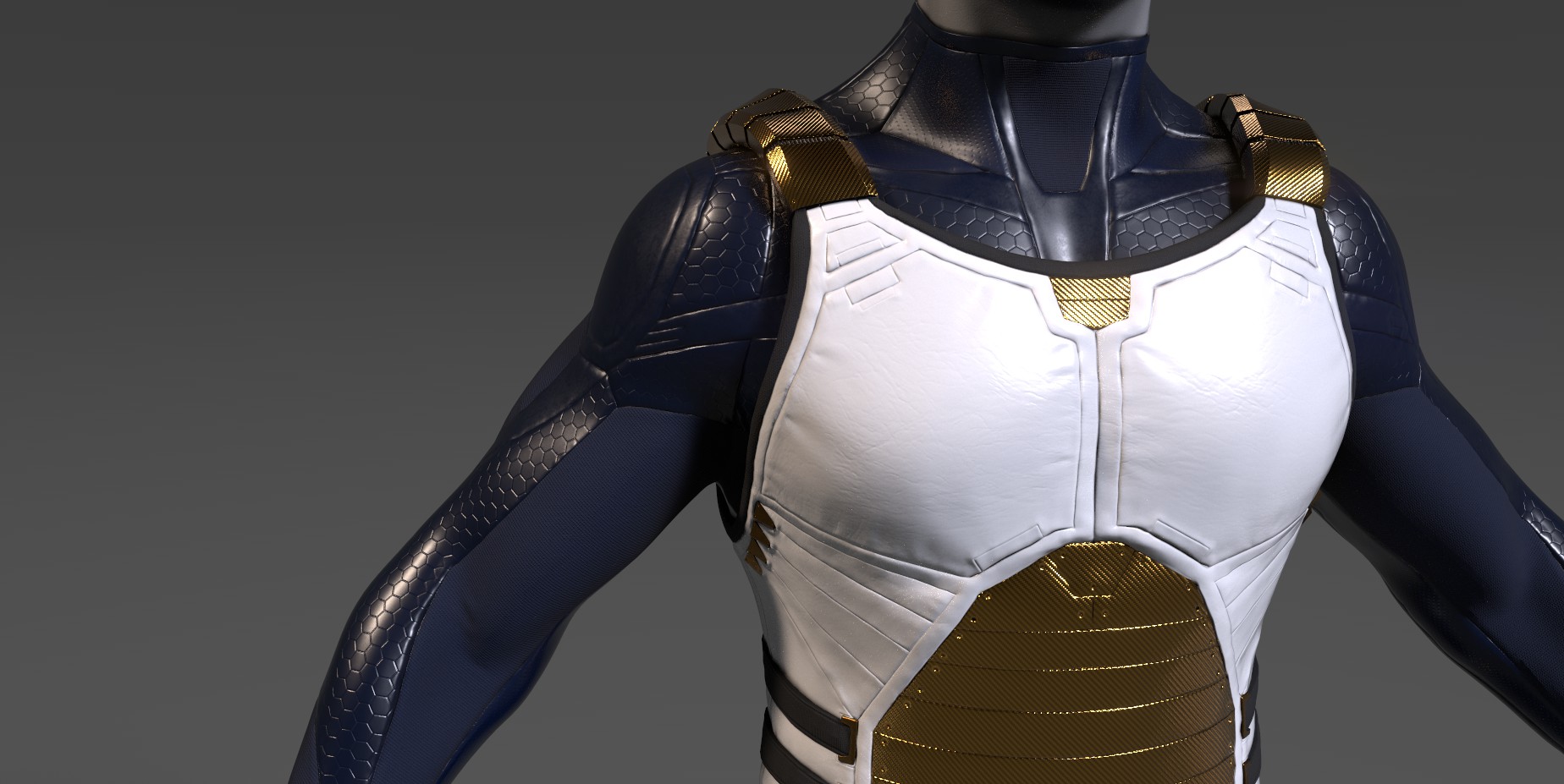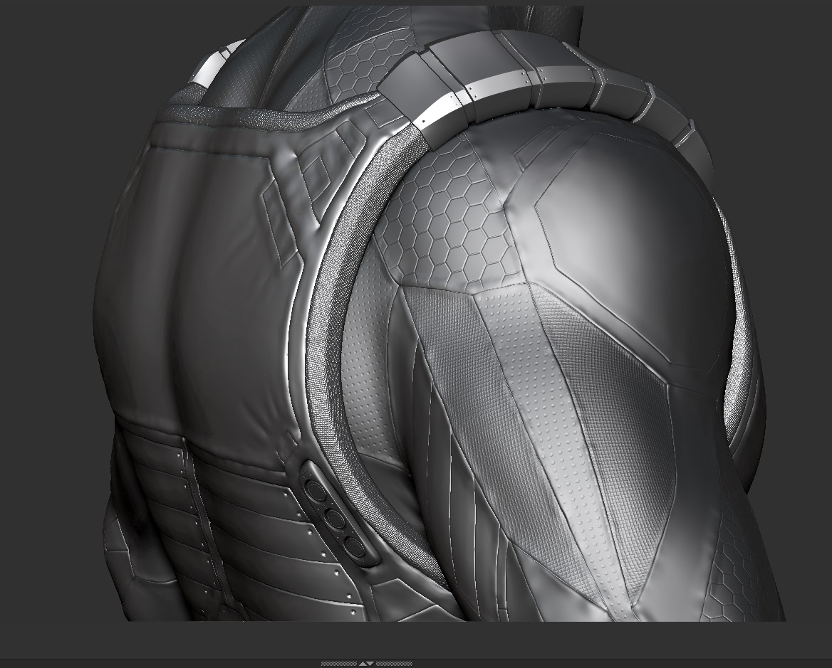por ejemplo el azul queda bien en las zonas con textura hexagonal y en la hombrera, pero la parte interior del codo, que sería más flexible, parece quedar mejor con el gris, no sé, yo iría probando a ver. Difícil de aconsejar.