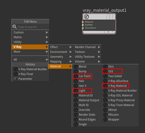 Los ajustes preestablecidos listos para renderizar están disponibles en los siguientes sombreadores: Material de rayos V, V-Ray CarPaint, V-Ray Light, V-Ray SSS y V-Ray VolumeGrid Shader.