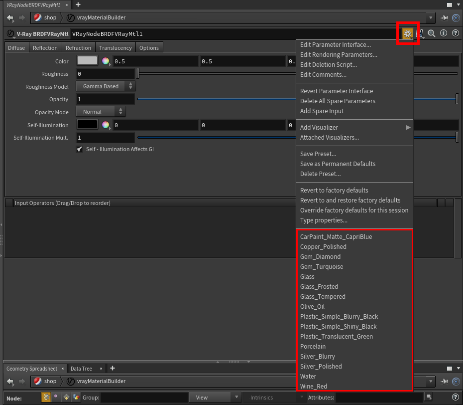 En los parámetros del material se encuentra el icono del menú de engranajes, que abre los ajustes preestablecidos. La imagen muestra los ajustes preestablecidos de material de V-Ray.