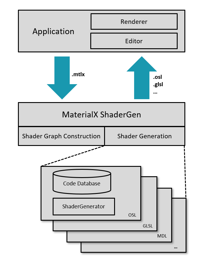 Un marco de generación de sombreador se implementa como parte de MaterialX. Esto puede ayudar a las aplicaciones a transformar la descripción de datos MaterialX agnóstica en el código del Shader ejecutable para un representador específico. Un módulo de biblioteca denominado MaterialX GenShader contiene las características principales de generación de sombreadores y la compatibilidad con lenguajes específicos reside en bibliotecas independientes, por ejemplo MaterialXGenGlsl, MaterialXGenOsl.