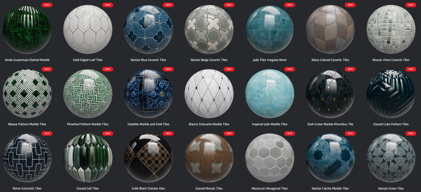 Actualmente, la biblioteca ofrece más de 290 materiales, como paredes, telas, metal, piedra, concreto, madera, pisos, techos y otros. Los materiales también se dividen en colecciones, que incluyen entornos forestales y de montaña; interiores modernos y medievales y exteriores urbanos.