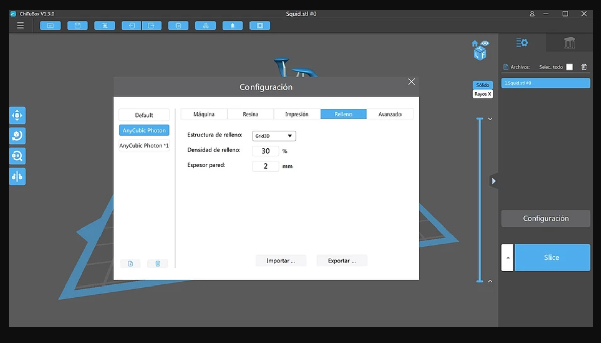 Los modelos tienen que estar huecos. Al pasar estos modelos al Chitubox o a cualquier programa laminador como CURA, Repetier, Solidify3D etc, es cuando le puede pedir al programa que rellene el objeto que puede ser al 100% al 50% o al 10% o sea, a cualquier valor que quieras ponerle entre 10 y 100 por ciento.