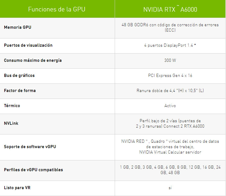 Eficiencia energética, con un diseño de doble ranura y eficiencia energética, el RTX A6000 es hasta 2 veces más eficiente en energía que las GPU de Turing y está diseñado para adaptarse a una amplia gama de estaciones de trabajo de proveedores OEM de todo el mundo. Más información en la web de Nvidia.