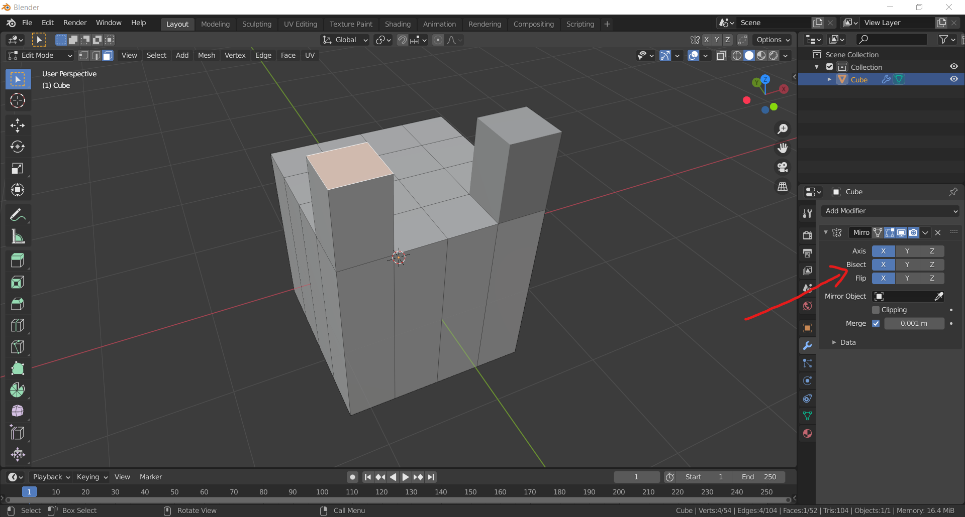También puedes usar bisect y flip. Bisect elimina una mitad del modelo desde el centro (lo que mucha gente hace antes de aplicar la simetría manualmente).