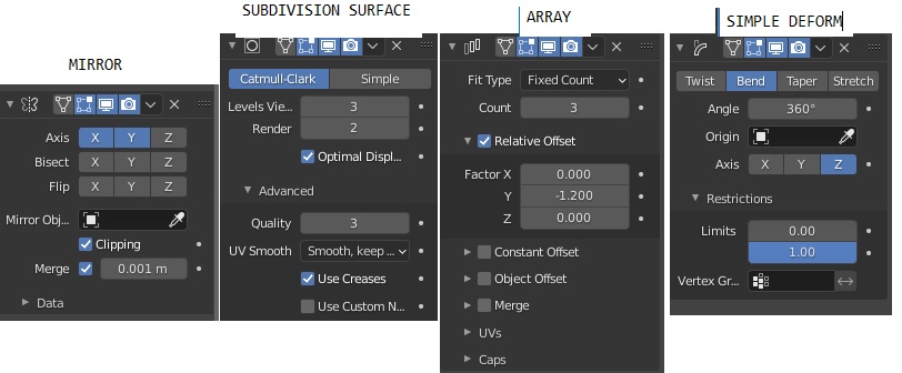 Use los siguientes modificadores como lo hace el señor en este tutorial: 1 - Mirror/ 2- Subdivisión Surface/ 3- Array / 4- Simple Deform