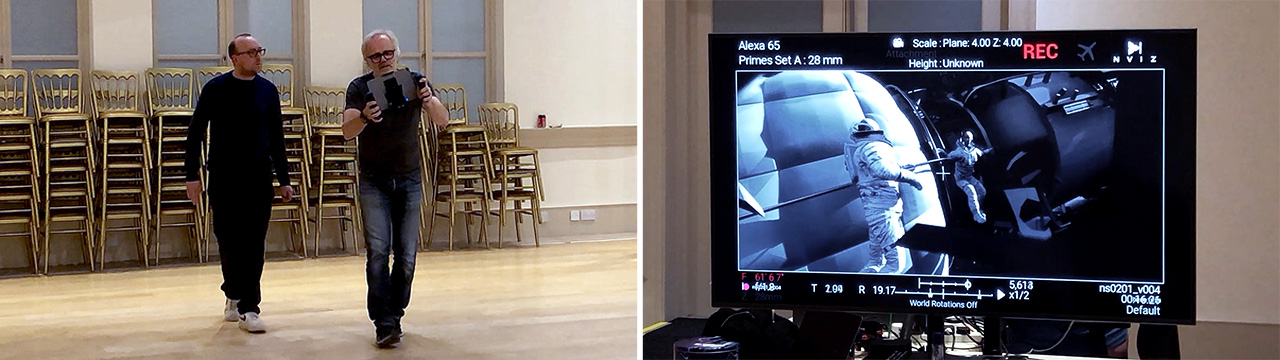 Las dimensiones de los entornos asociados se marcaron entonces en los suelos del espacio de ensayo, permitiendo a Clooney y Ruhe caminar a través de un espacio físico mientras veían su correspondiente mundo virtual.
