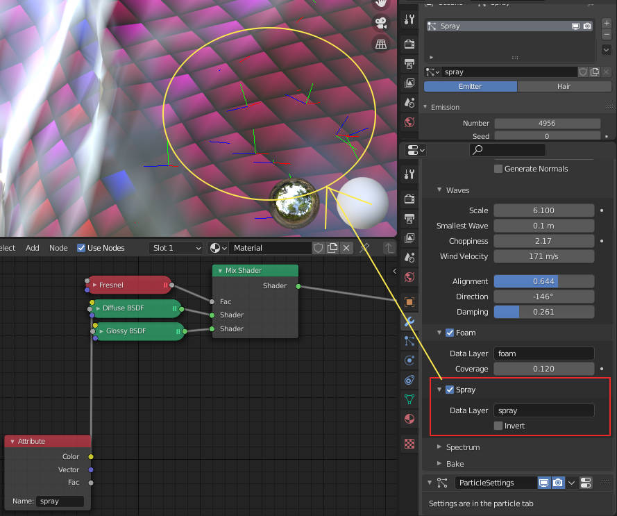 Trasteando la Blender 2.90, he visto que el modificador Ocean contiene junto al "foam" la opción de añadir direcciones (mediante vertex colors en las caras) a un sistema de partículas para simular el spray, tal como está implementado en los fluidos.