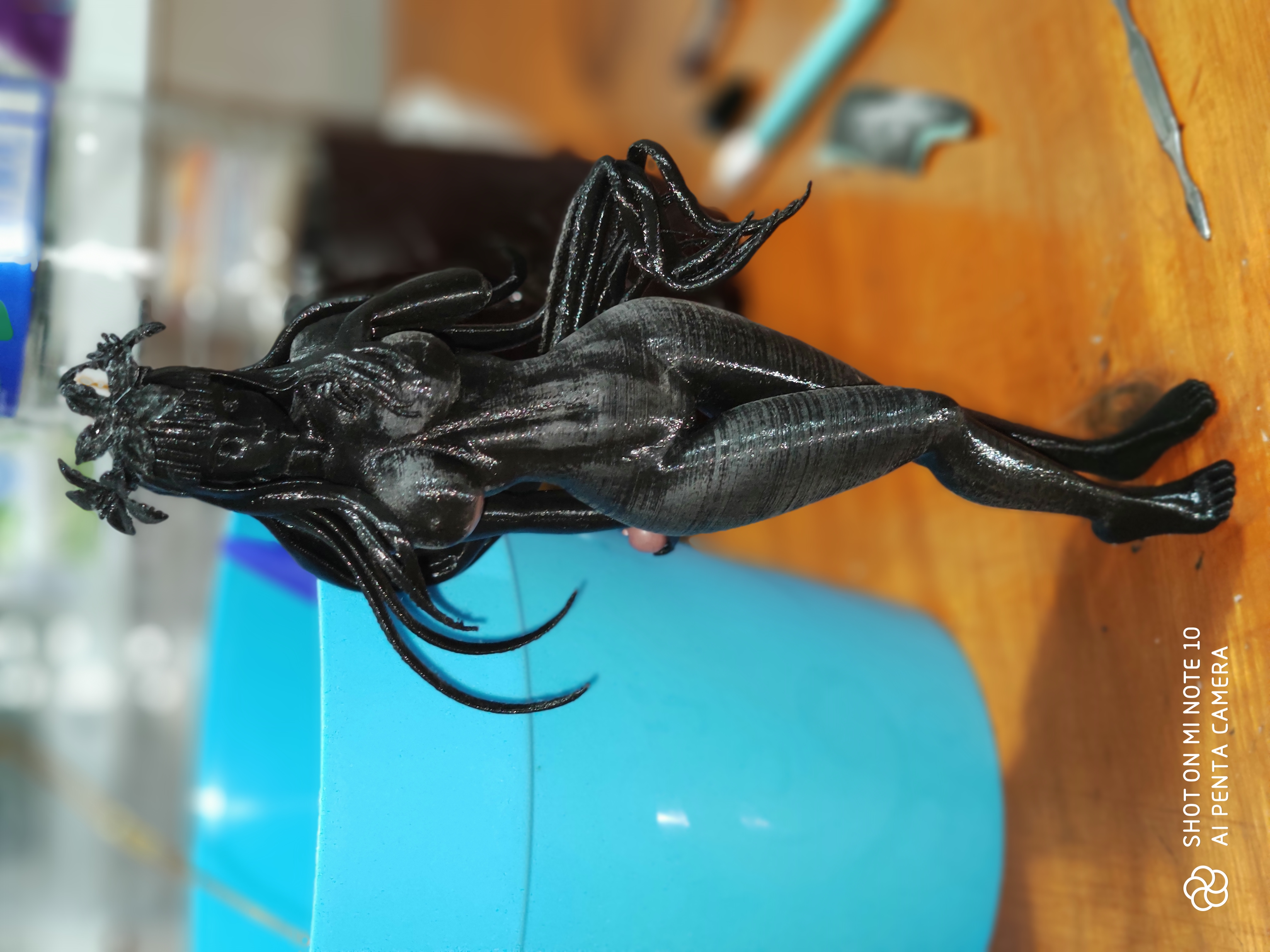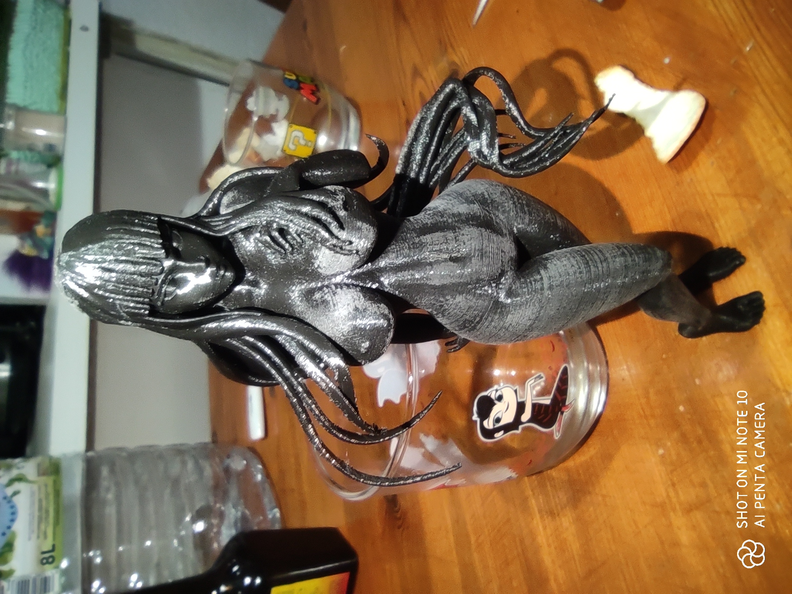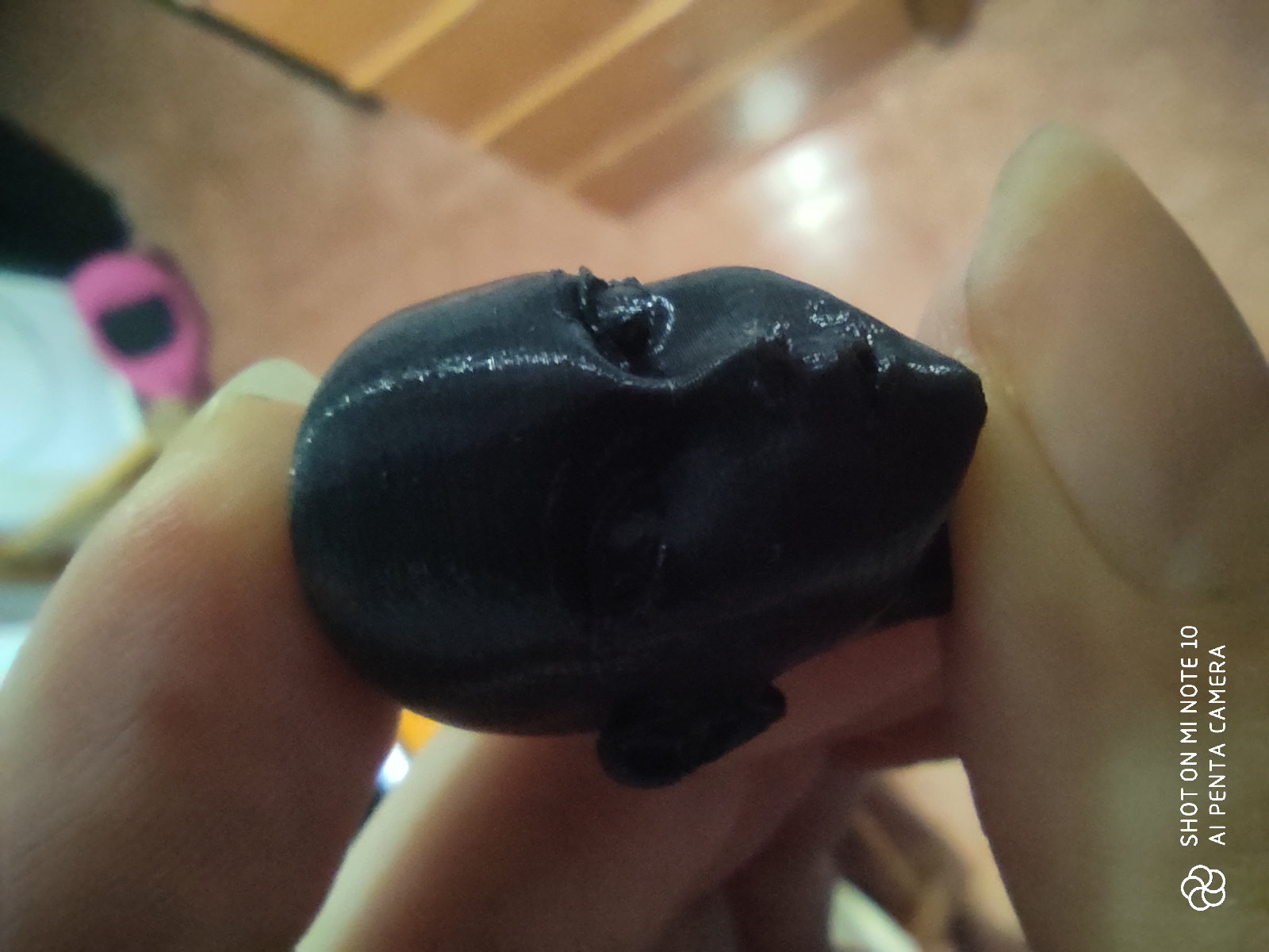 El pelo tardo la friolera de 11 horas, fue lo primero que hice, que si esto no salía bien no seguiría con la impresión y al final quedo muy bien mejor de lo que se aprecia en la fotografía, todo se lo debo al Nozzle de 0.2 al hacer las paredes a la mitad no crea mucha rebaba por la retracción y los soportes finos son fáciles de quitar.