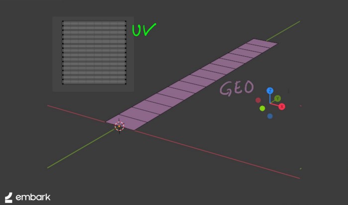 La geometría de una tira de pelo básica se ve así (el UV está normalizado):