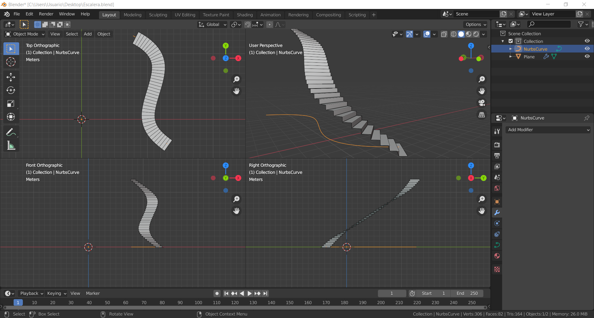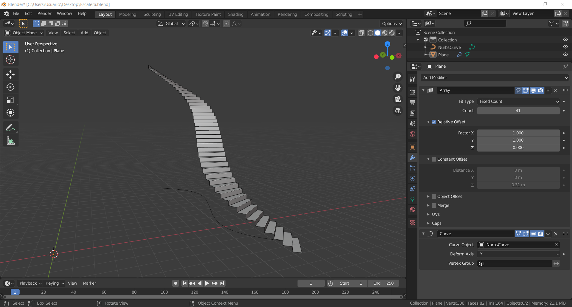 He estado mirando tutoriales pero solo encuentro formas de hacer la escalera con el modificador Array pero de esta forma solo se puede hacer una escalera recta que no se puede torcer y que quede correctamente.